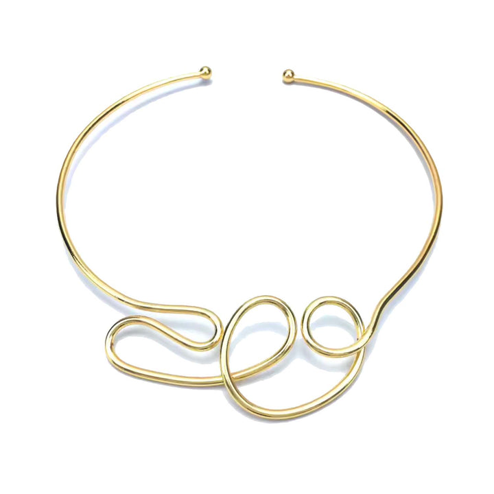 This choker necklace is crafted from an unspecified gold-plated metal with an abstract design.