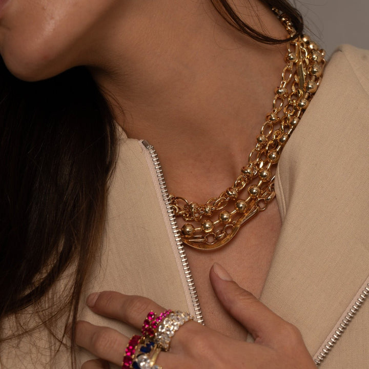 The Beaded Ball Bar Necklace by Shymi is a versatile and stunning accessory. It features 6mm beads separated by bars, making it perfect for both standalone wear and layering. This necklace allows you to upgrade your accessory game with its stylish and elegant design.