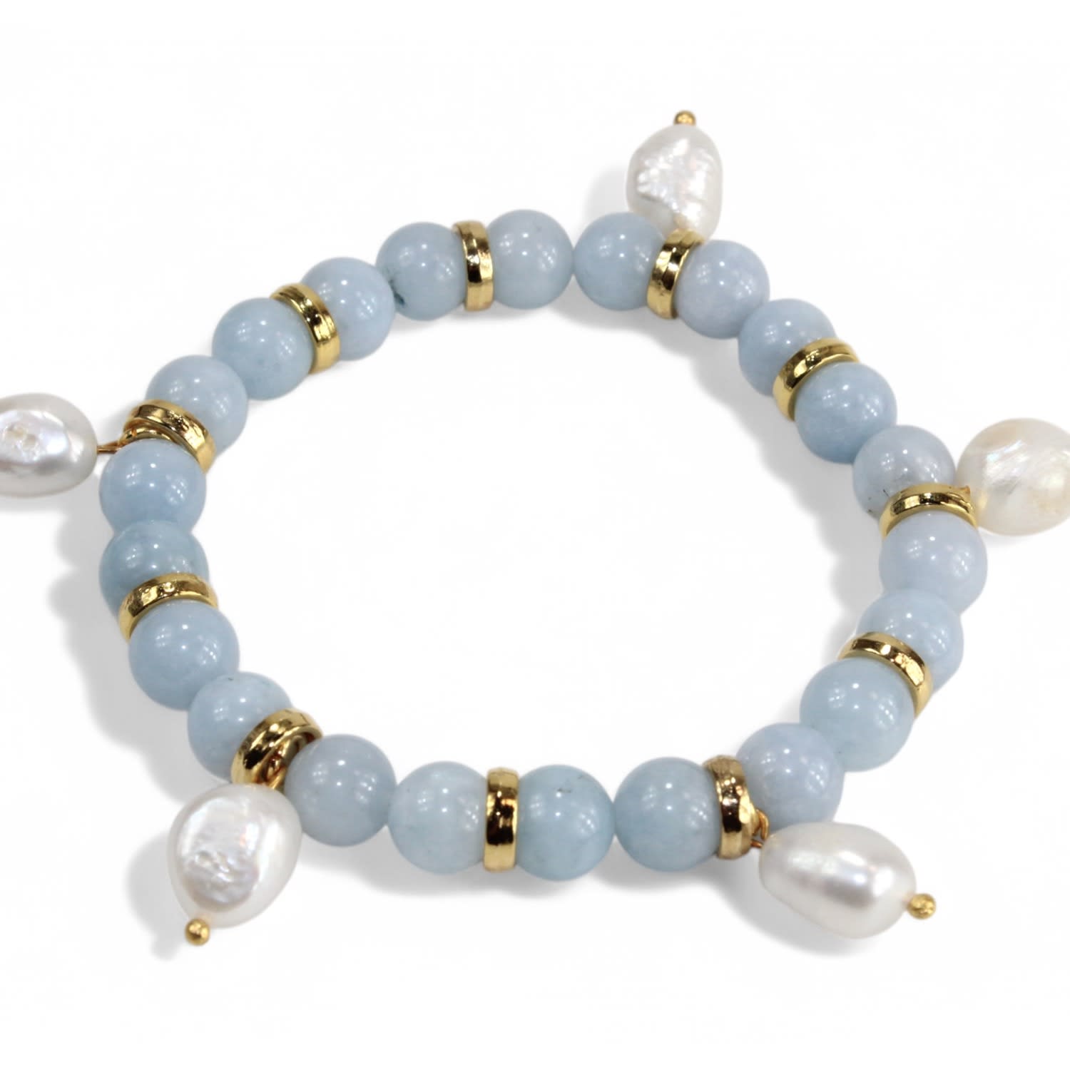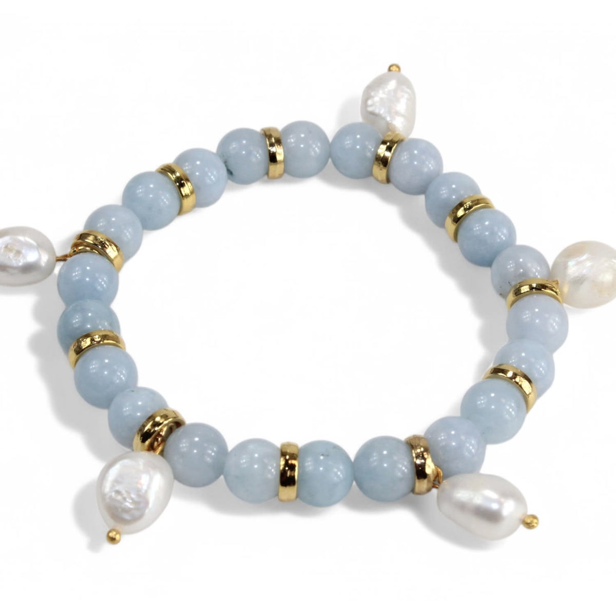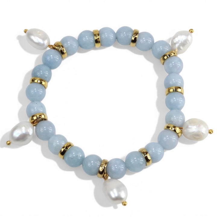 This bracelet is handcrafted using Angelite stone, genuine freshwater pearls, and gold-plated brass components. It is adjustable between 17–20 cm.
