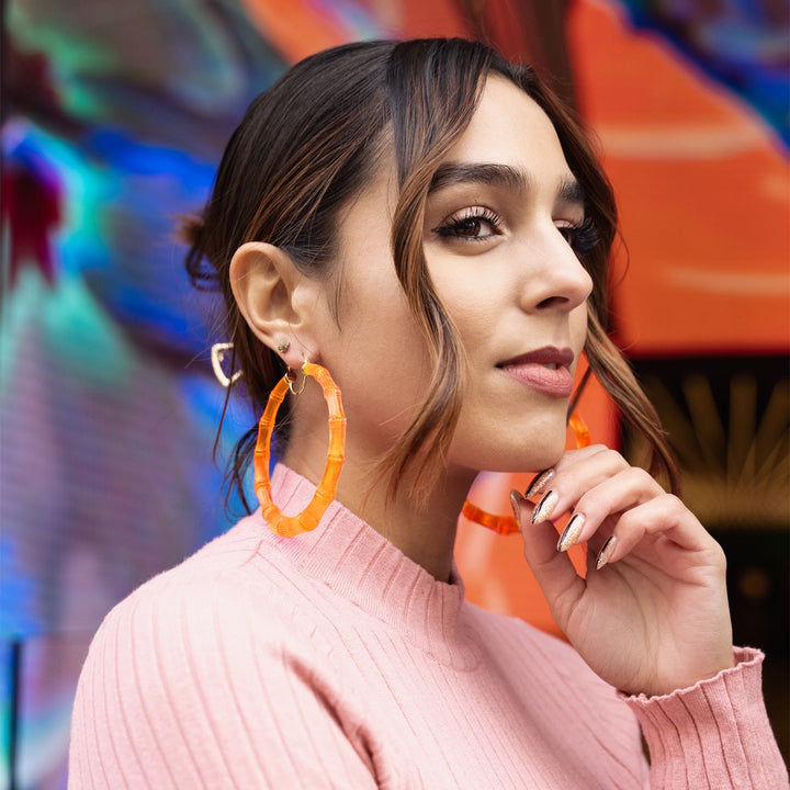 These XL Bamboo Hoop Earrings by Gold & Honey are a must-have statement piece with a classic 90s twist. The 3-inch hoops are made from lightweight lucite with a beautiful honey color, and they are handcrafted with 14k gold-plated sterling silver posts. The unique bamboo design adds a chic and playful touch to any outfit. These earrings are a confident accessory that proves you are a Queen who knows how to make a statement.