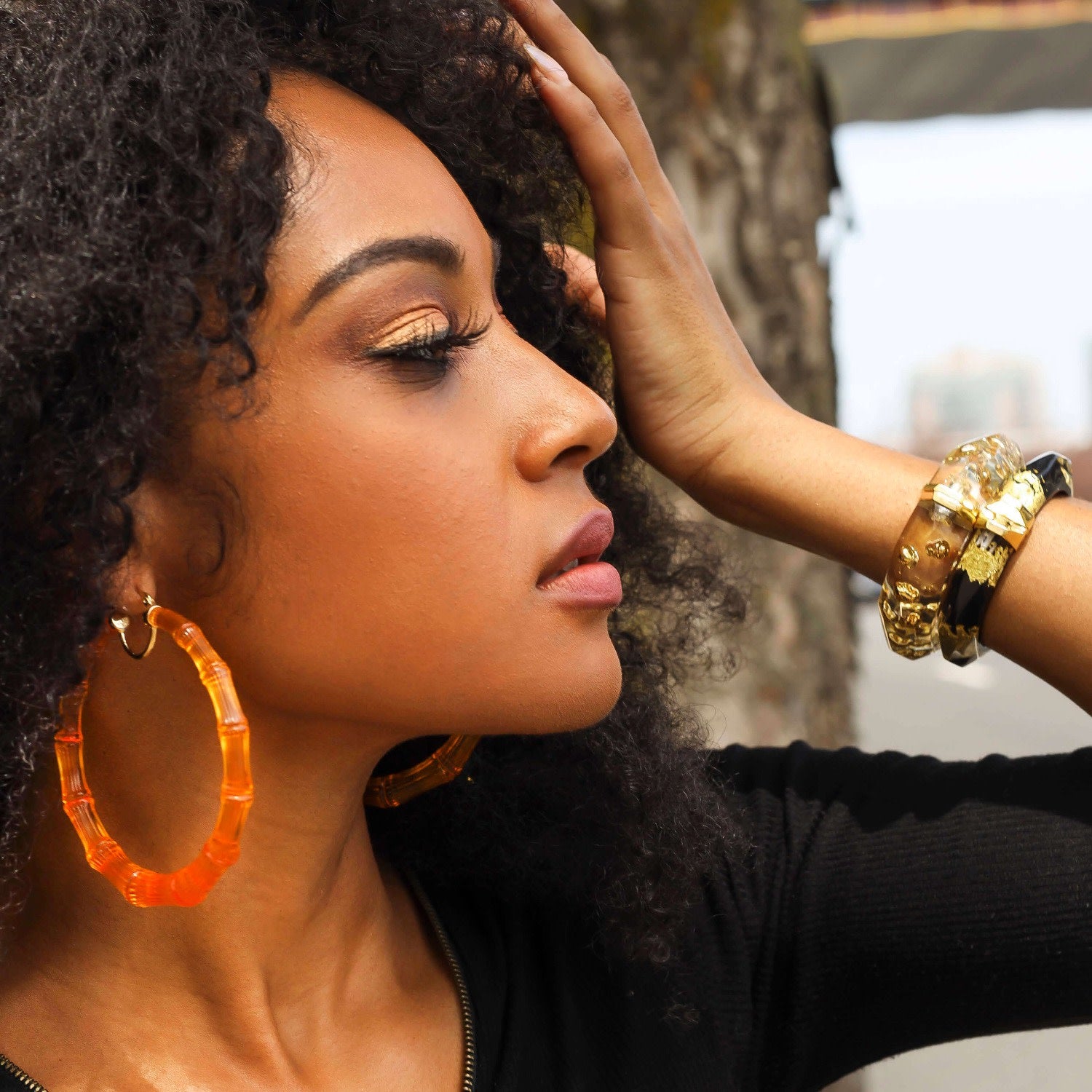 These 3-inch hoops are handcrafted from lucite in a honey color with a bamboo design. They are made with 14k gold-plated sterling silver posts.