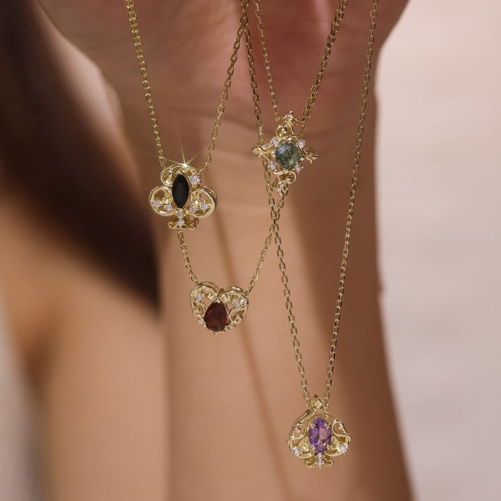 This Clover Club Black Onyx Necklace by Azura Jewelry New York is a striking piece that blends classic grace with a dash of boldness. It features a bold marquise black onyx set in a clover leaf design, exuding both mystery and charm. Gleaming white topaz accents complement the onyx, making this necklace a true standout. The clover symbolizes continuous growth, guiding you through every chapter of success. Made with 14K yellow gold vermeil, it’s a beautiful and meaningful accessory.