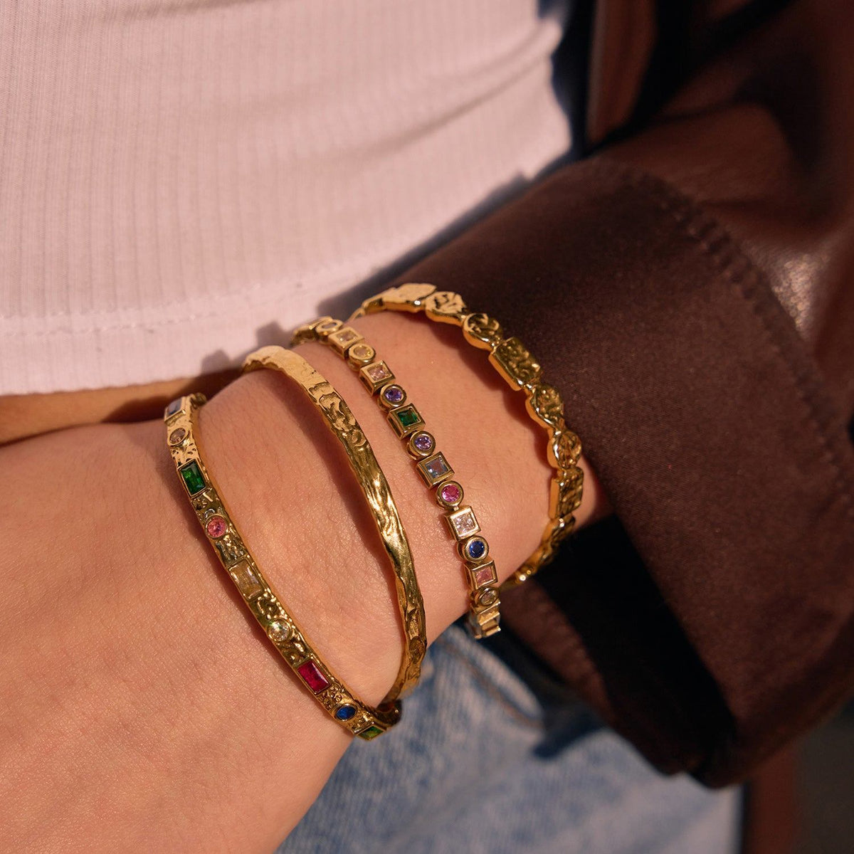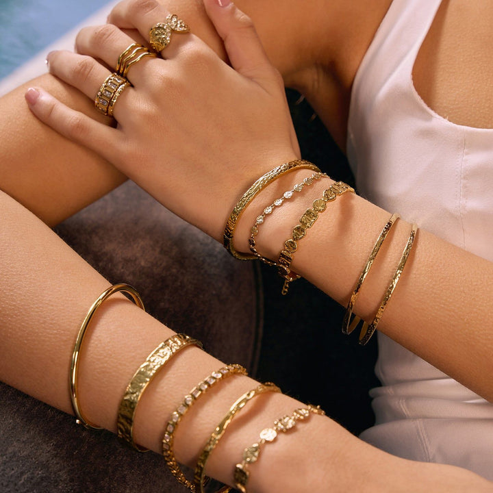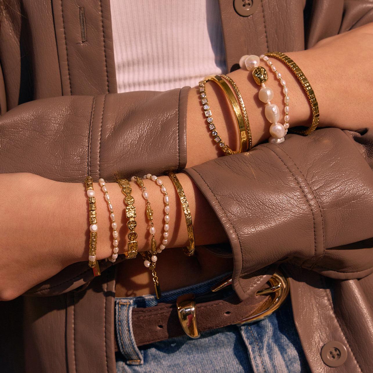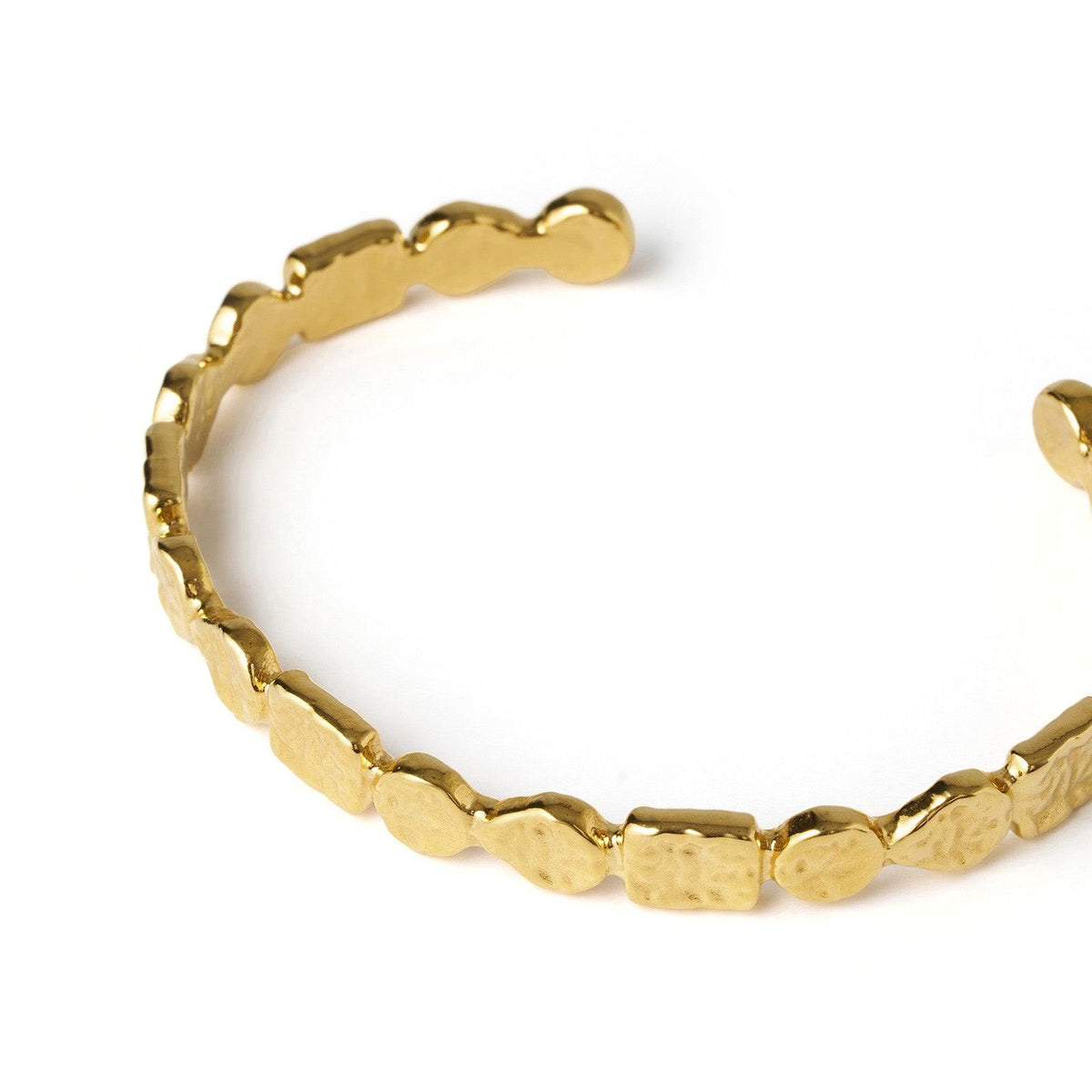This cuff is crafted from a stainless steel base with a 1-micron thick 14k gold plating. It is E-coated for a premium finish and is tarnish-free and waterproof.