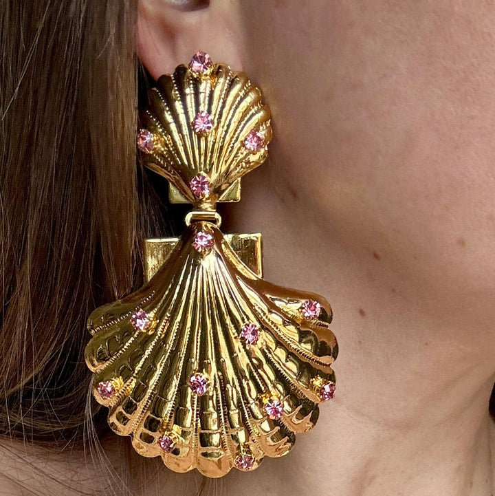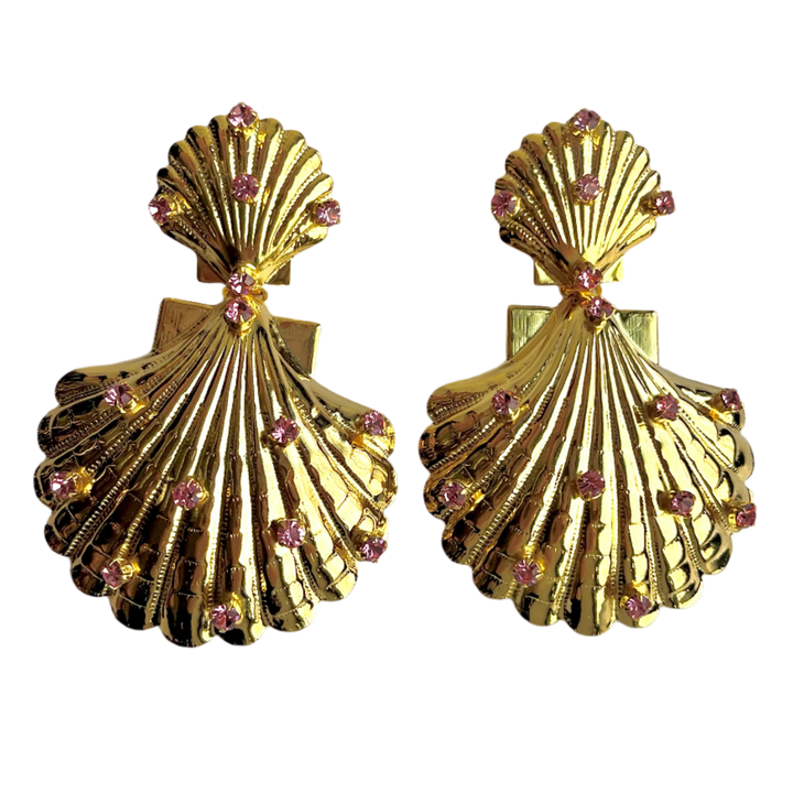 These Pink Crystal Gold Shell Earrings by Laura Gray are a luxurious and lightweight accessory. The large gold shells are adorned with pretty light pink crystals, creating a beautiful and delicate shimmer. These handcrafted earrings are the perfect choice for your next summer vacation, adding a touch of effortless glamour and beach-inspired elegance.