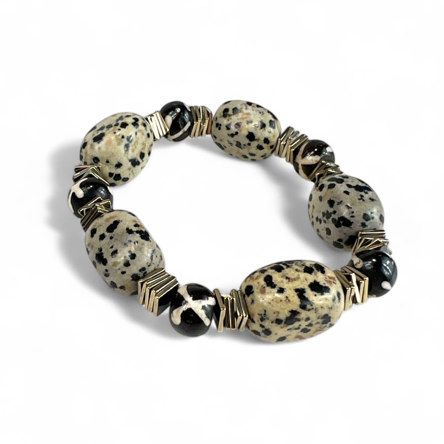 This bracelet is made of Jasper natural stones, African beads, and designer brass components. It is approximately 17-18cm in length.