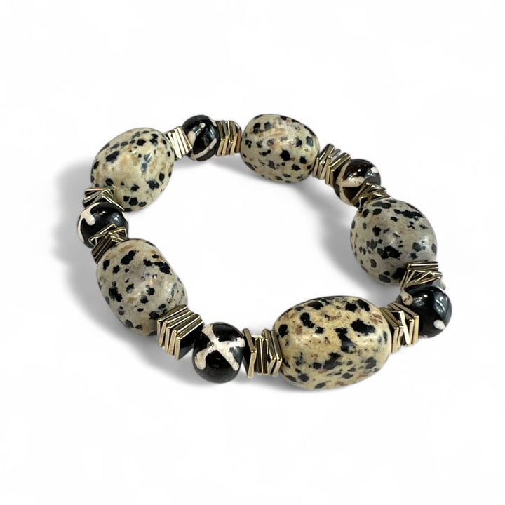The Jasmine Jasper Beaded Bracelet by By Virgo is a unique and handcrafted accessory. This bracelet is made in limited quantities using jasper natural stones, African beads, and designer brass components. Due to the use of natural materials, each piece is unique. It is approximately 17-18cm in length and is a beautiful blend of different textures and colors.