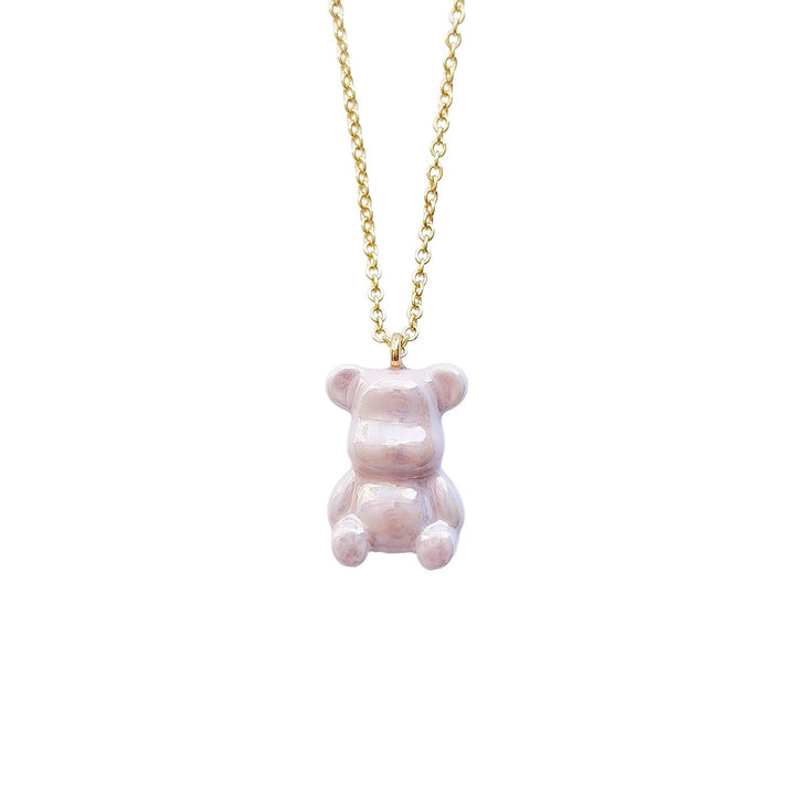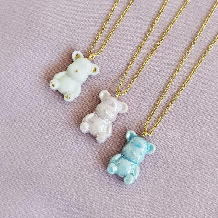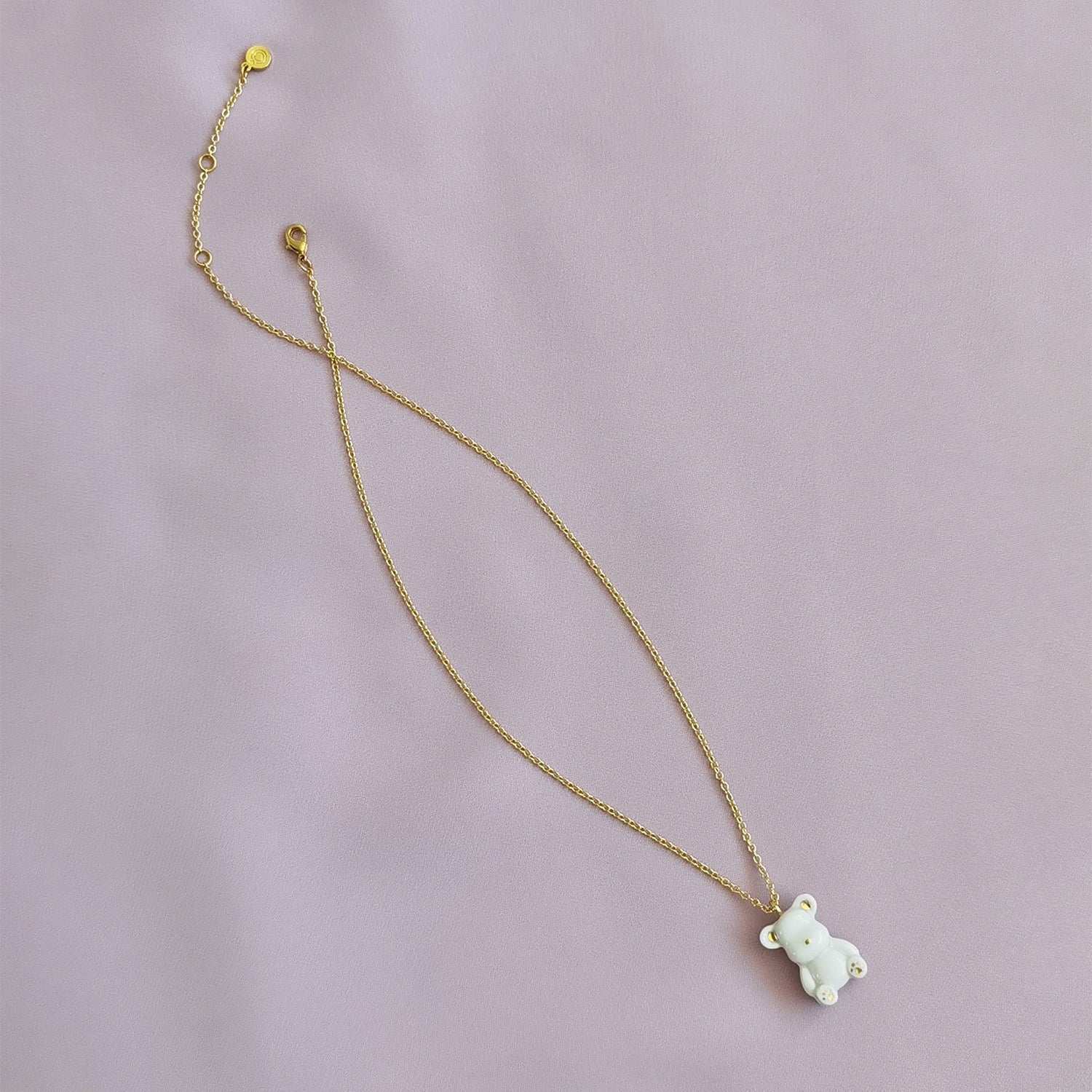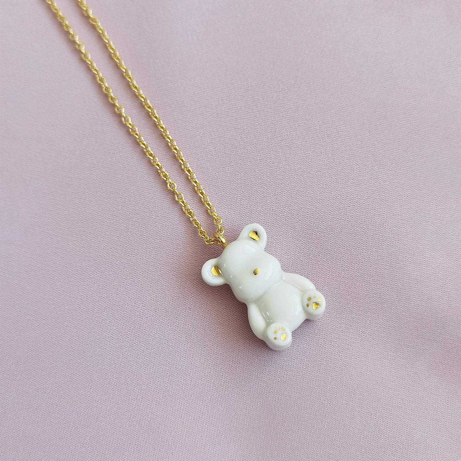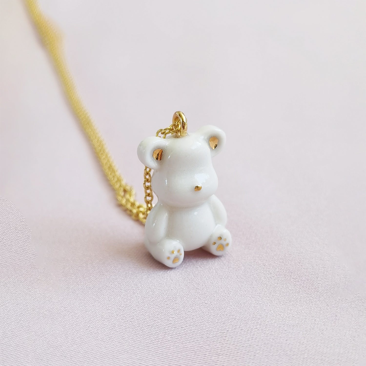 The Classy White & Gold Porcelain Teddy Bear Necklace by Poporcelain blends whimsy with sophistication. Handmade and double-sided, each porcelain bear adds playful charm to everyday outfits.