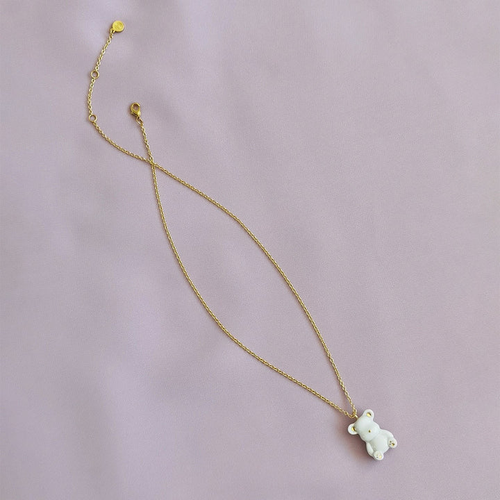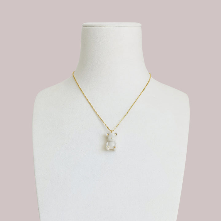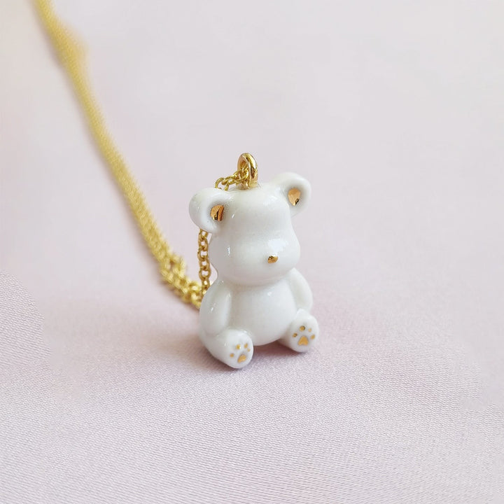 Classy White And Gold Porcelain Teddy Bear Necklace