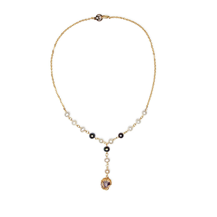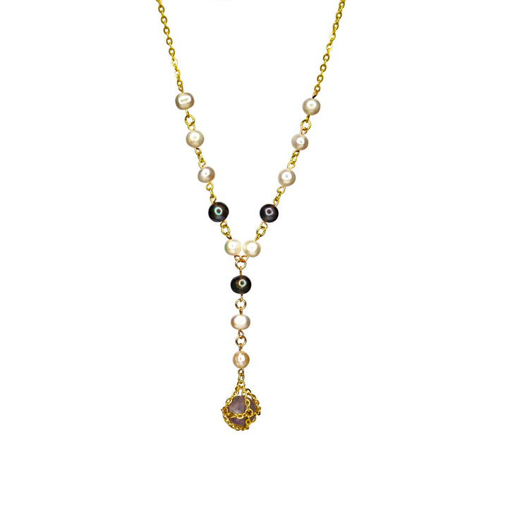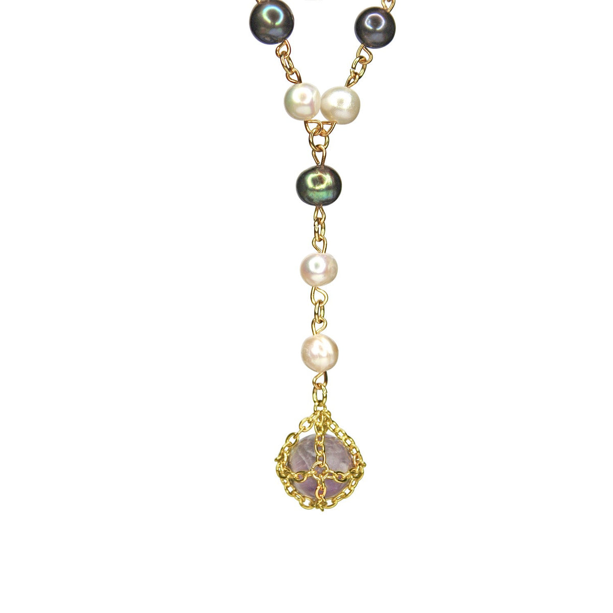 This Amethyst Pearl Lariat by Mhart is a truly one-of-a-kind piece. The unique lariat design is handcrafted from a mix of linked white and black freshwater pearls and natural amethyst stones, creating a piece that is both elegant and bohemian. This necklace celebrates the individuality of each stone and pearl, making it a personal and treasured accessory.