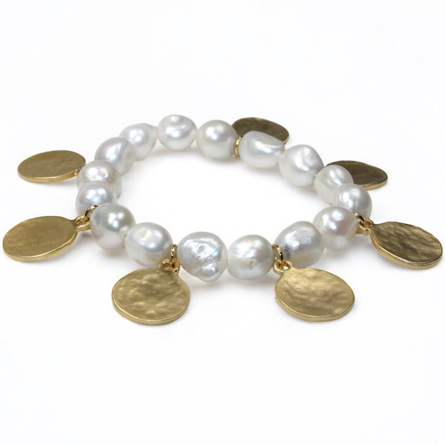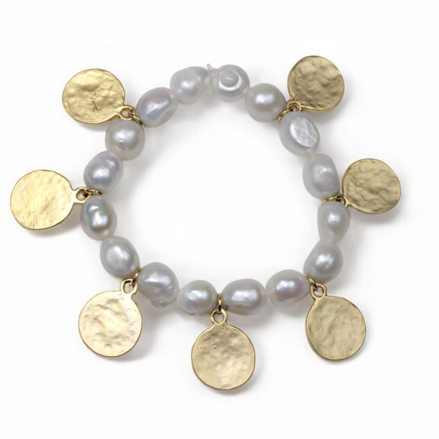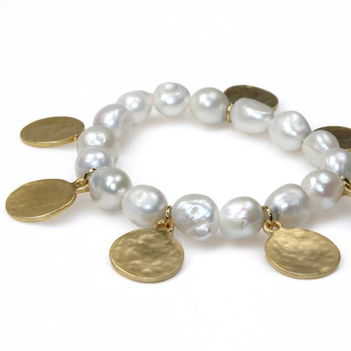 This bracelet is handcrafted from genuine freshwater pearls and matte gold-plated brass components.
