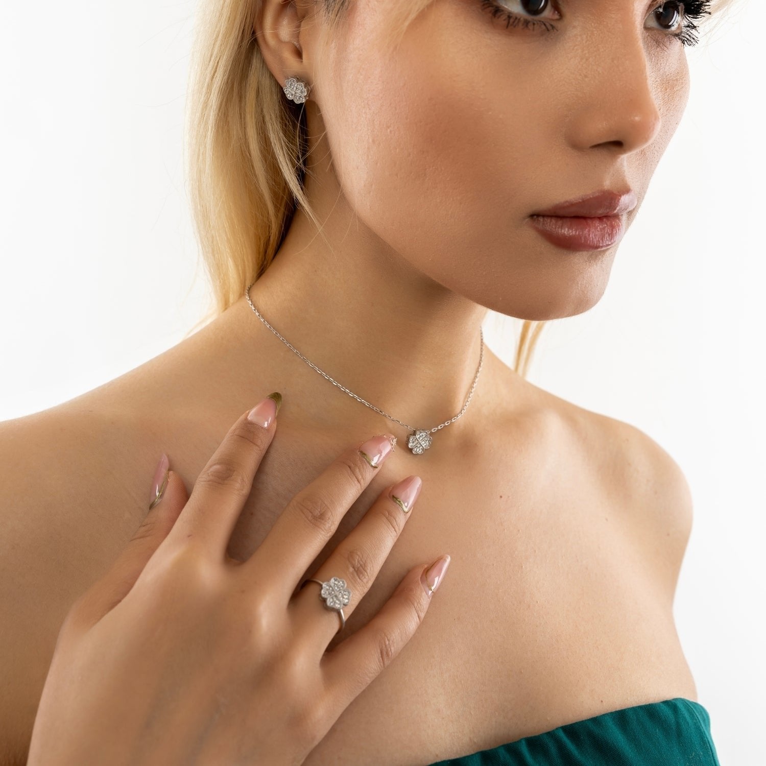Four Leaves Clover Necklace In Silver With Clear Gemstones