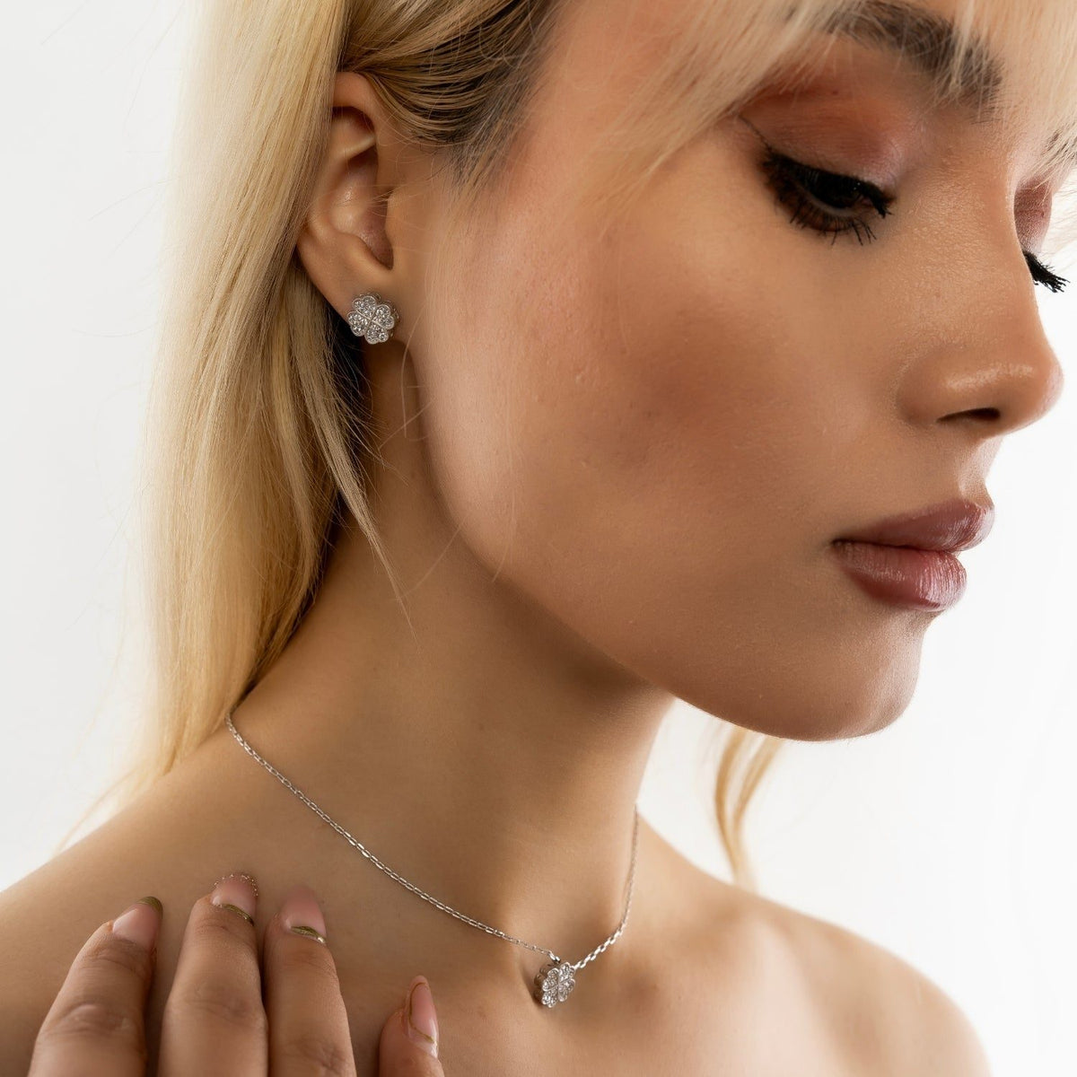 This Four Leaves Clover Necklace In Silver With Clear Gemstones by Mejoma is a charming and lucky accessory. This handcrafted necklace is made with high-quality silver and sparkling white gemstones, creating a beautiful four-leaf clover design. It's a great piece to bring good fortune and charm to your everyday style.