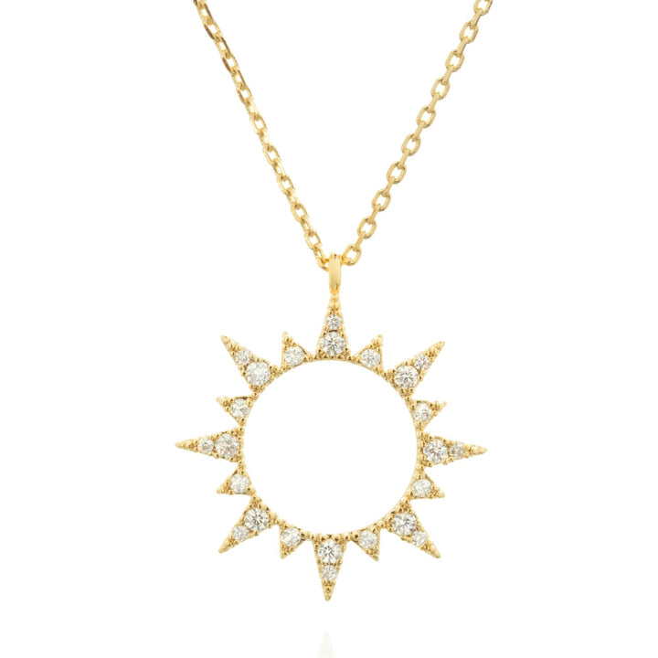 This necklace is 16k gold-plated and features a sun-shaped pendant with a cubic zirconia gem.