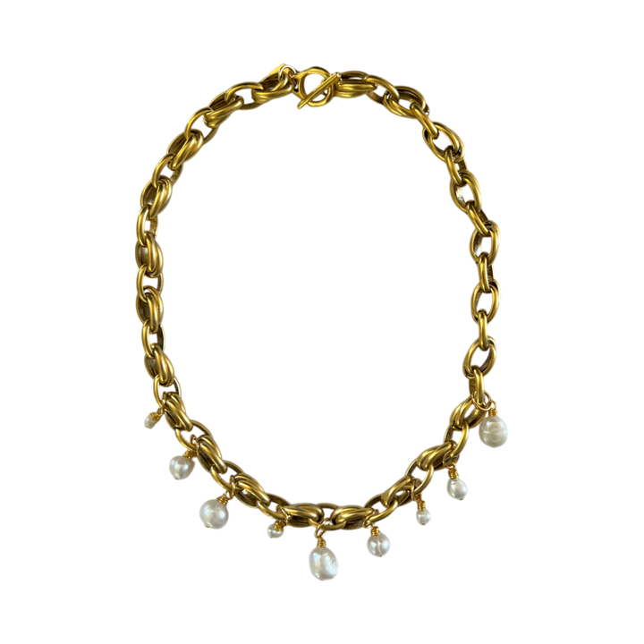 This 17-inch necklace is crafted from 12k antiqued gold-plated brass with a 12k antiqued gold-plated pewter toggle clasp. It features hand-wire-wrapped freshwater pearls.
