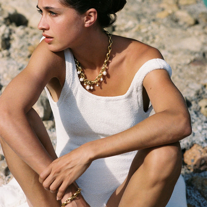 This Bari Pearl Charm Necklace by Sccollection is a beautiful and charming accessory. The necklace features hand-wire-wrapped freshwater pearls on a gold-plated brass chain. The toggle clasp makes it easy to slip on and off, making it a perfect piece to wear from day to night.