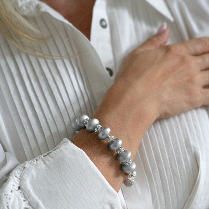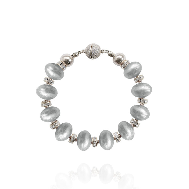 The Mika Bracelet in Cloudy Sky by Saule Label is a piece you’ll find yourself reaching for time and again. It perfectly balances metallic sparkle with hand-painted elegance, featuring a string of oval wooden beads interspersed with shimmering Crystal Rondelles. The magnetic clasp, adorned with cubic zirconias, adds a layer of effortless sophistication, making it both beautiful and easy to wear.