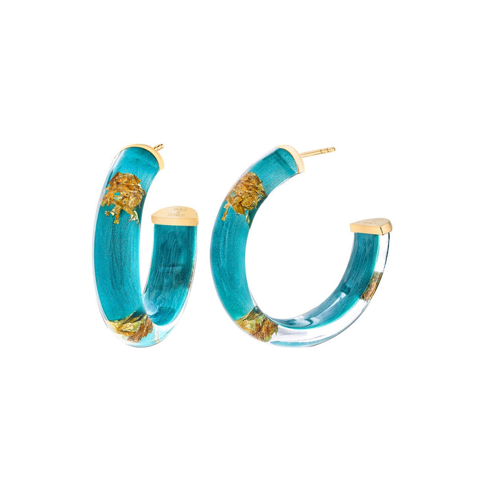 The Gold Leaf Hoop Earrings In Teal by Gold & Honey are a vibrant and versatile accessory. These handcrafted Lucite hoops feature 24K gold leaf that shines brightly and a hand-painted teal blue/green shimmer enamel. They are made with 14K gold-plated sterling silver posts and are perfect for transitioning from season to season.