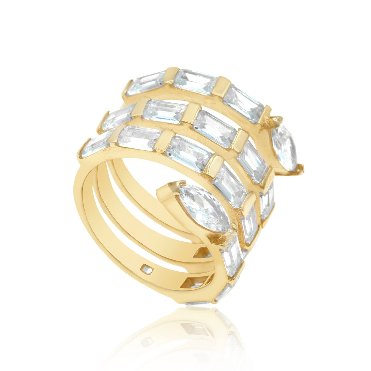 This ring is crafted from sterling silver with 14k gold-plating and features baguette-cut cubic zirconia stones with a shiny finish.