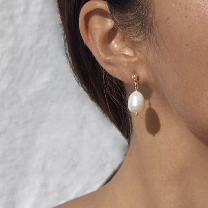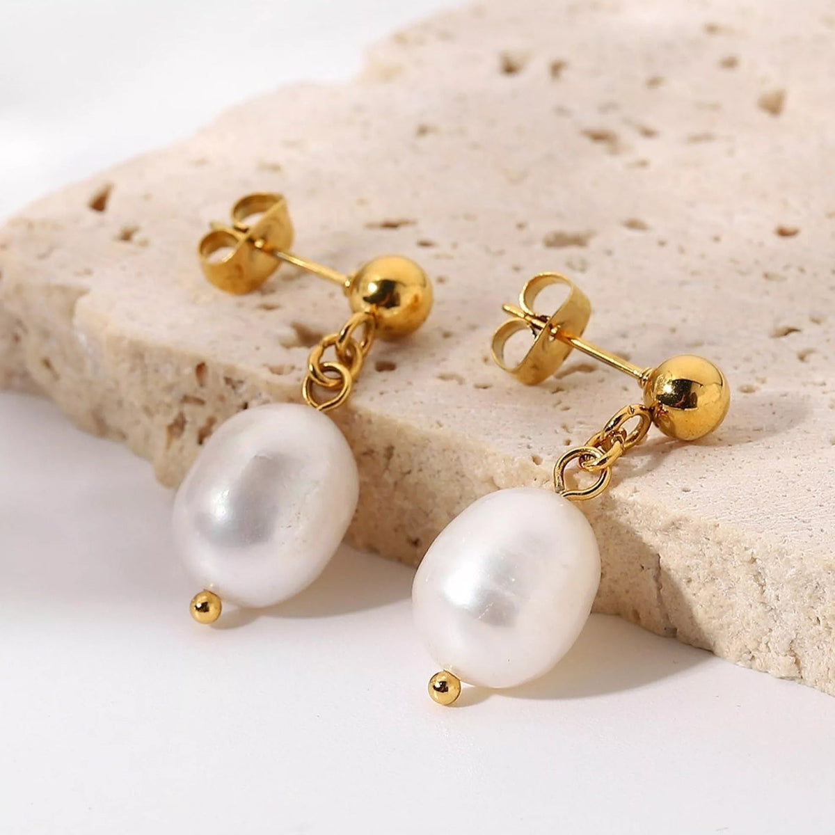 Stainless steel with gold plating. Genuine freshwater pearls. Drop length approx. 25.5mm.