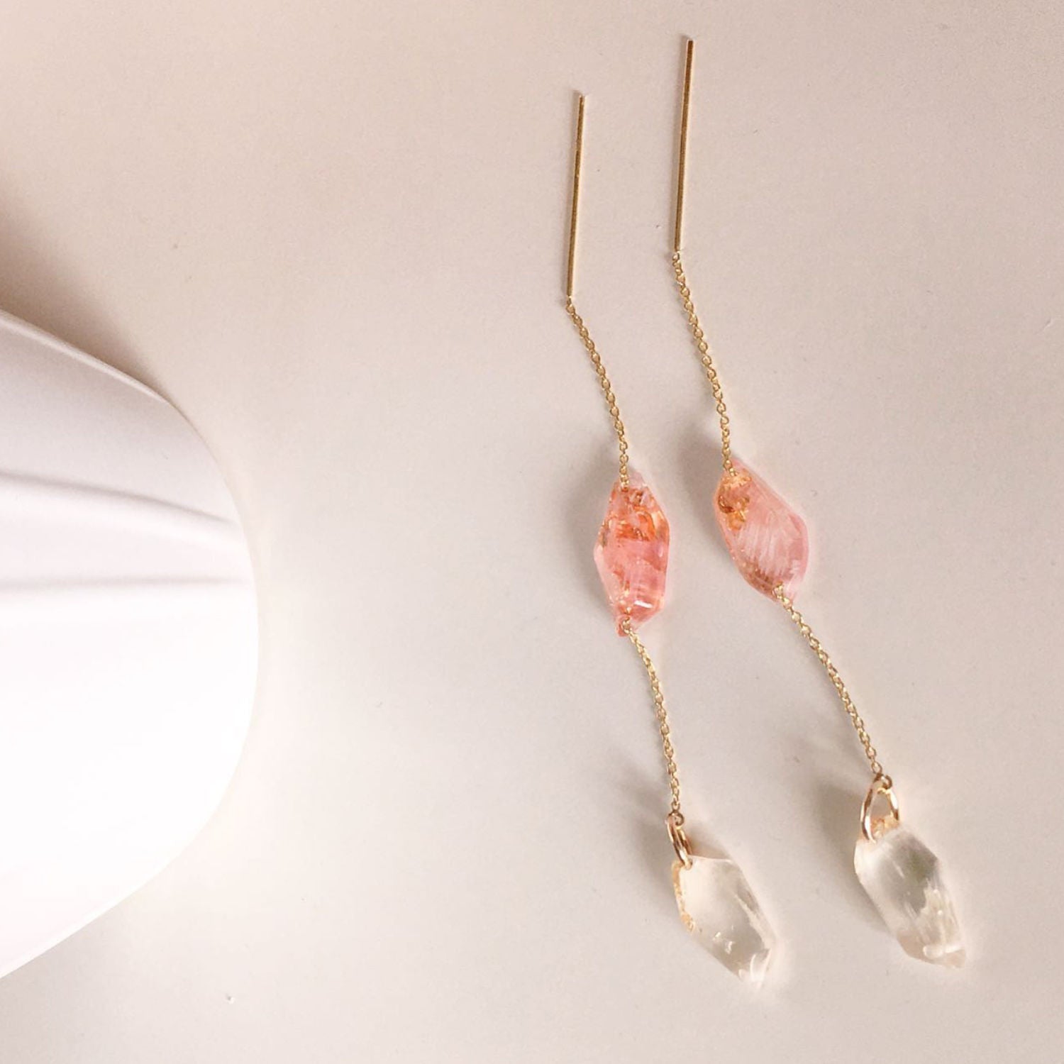 These thread earrings are handmade in London from recycled sterling silver with an 18k gold vermeil finish, plated to a thickness of 3 microns. They feature unique Bio-Gem pendants made from sweetcorn husk and gold leaf.