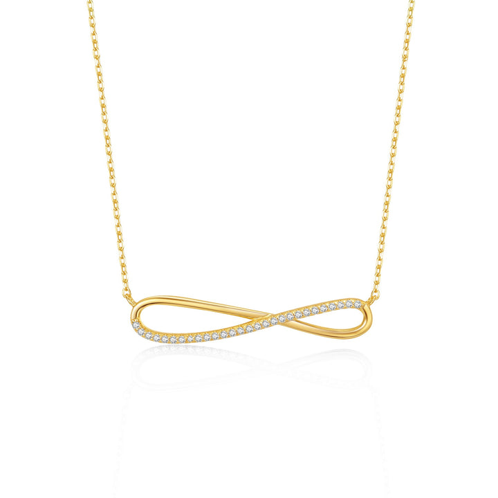 This pendant necklace is made from 14k gold-plated sterling silver and features an infinity symbol ribbon pendant with cubic zirconias. It has a secure lobster clasp.