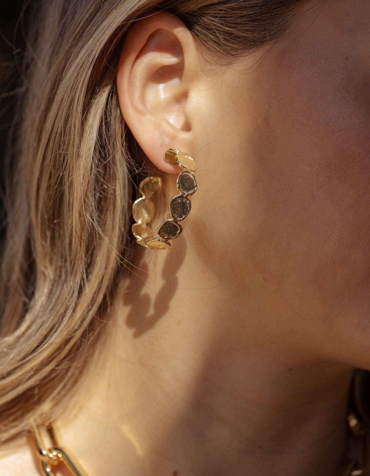 These 1.5-inch diameter hoop earrings are handcrafted from brass with an 18K gold-plated finish and feature molten coin accents.