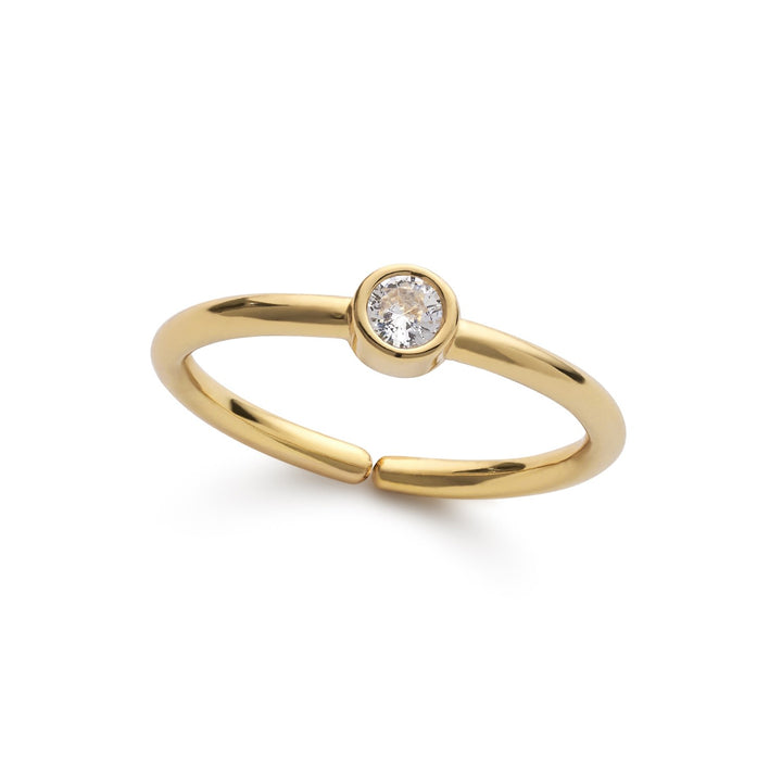 This adjustable ring is crafted from solid sterling silver and coated in genuine 18k gold plating. It features zircon stones and is one-size.