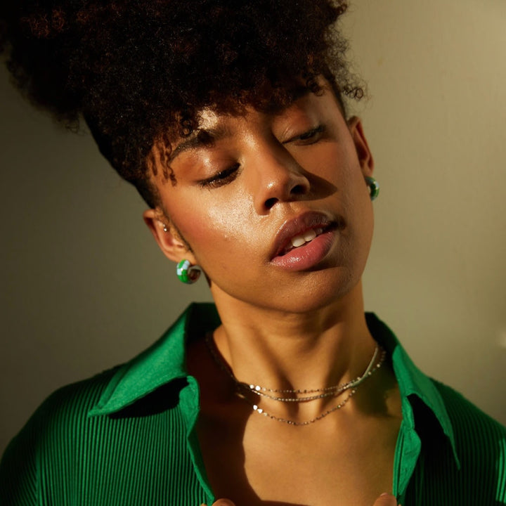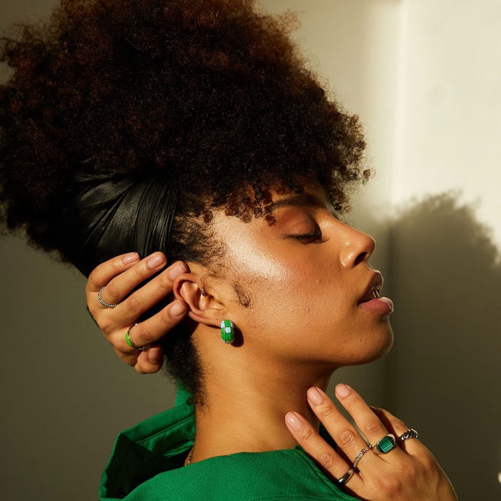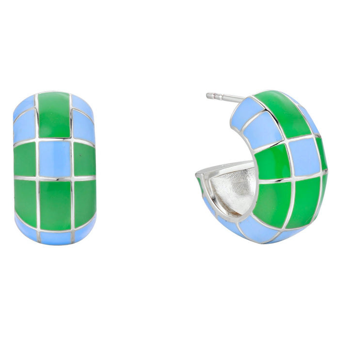 These chunky hoops are made from certified 925 sterling silver with a rhodium plating. They feature a blue and green enamel stripe.