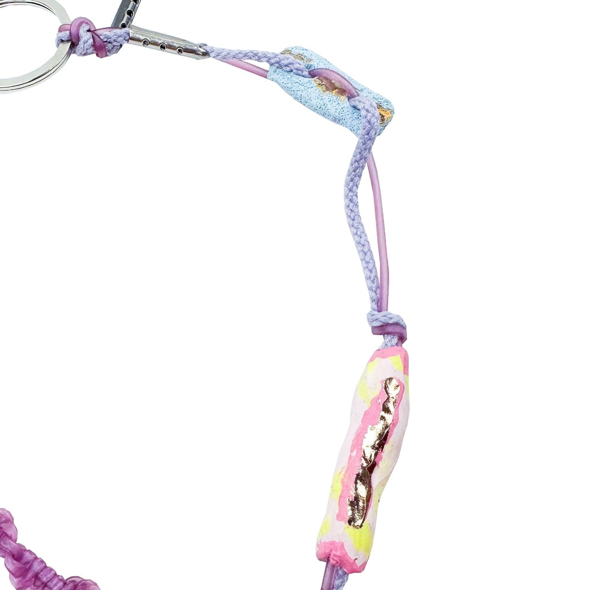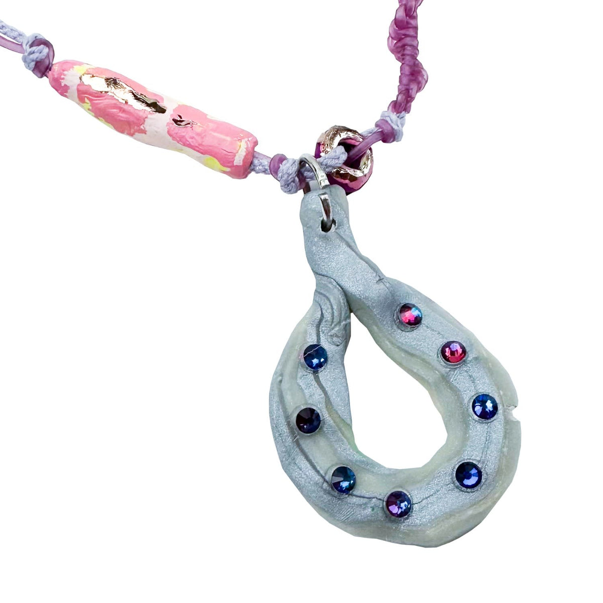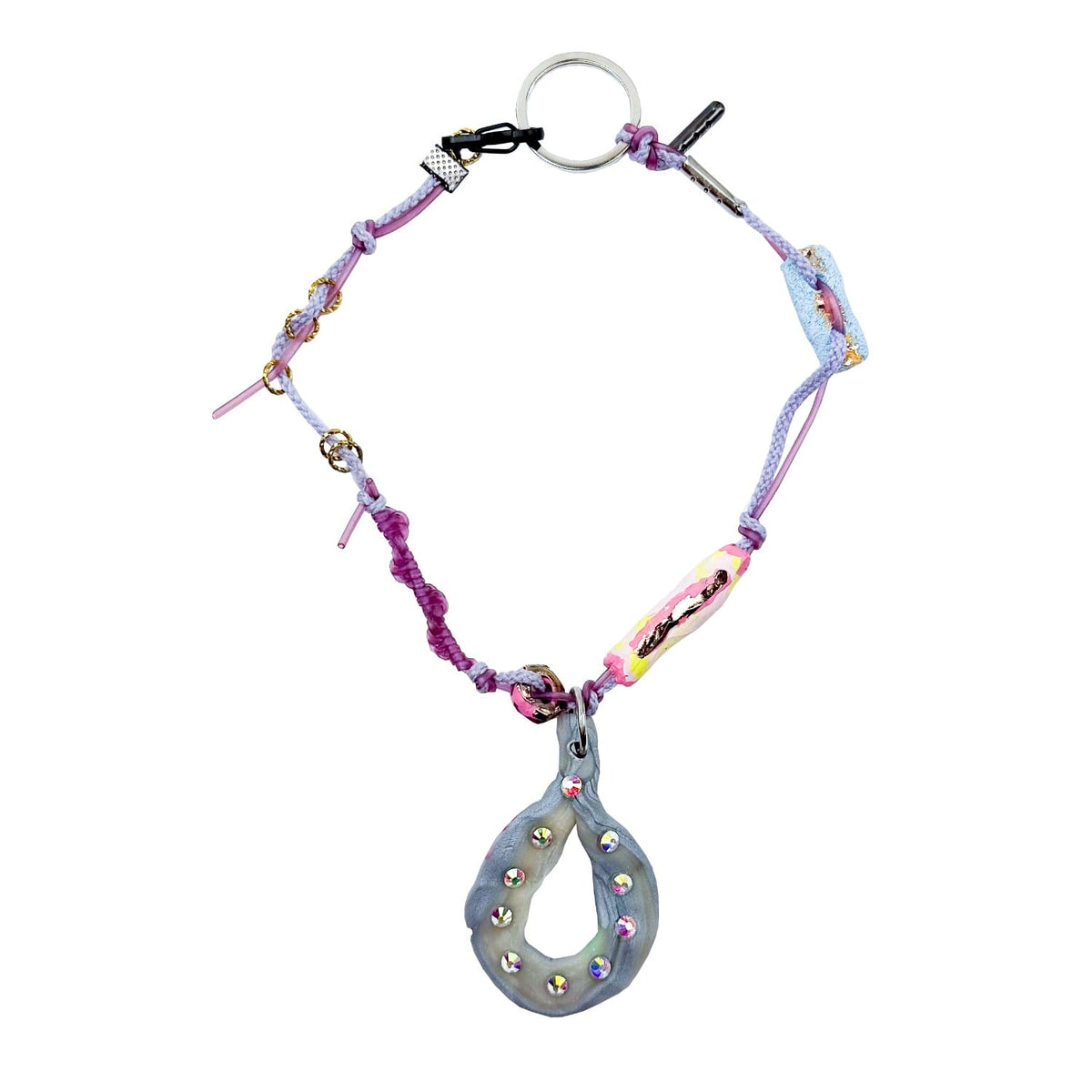 This handmade necklace is crafted from a mix of acrylic cord, plastic cord, polymer clay, foil, glass rhinestones, and metal. It is a one-of-a-kind piece.