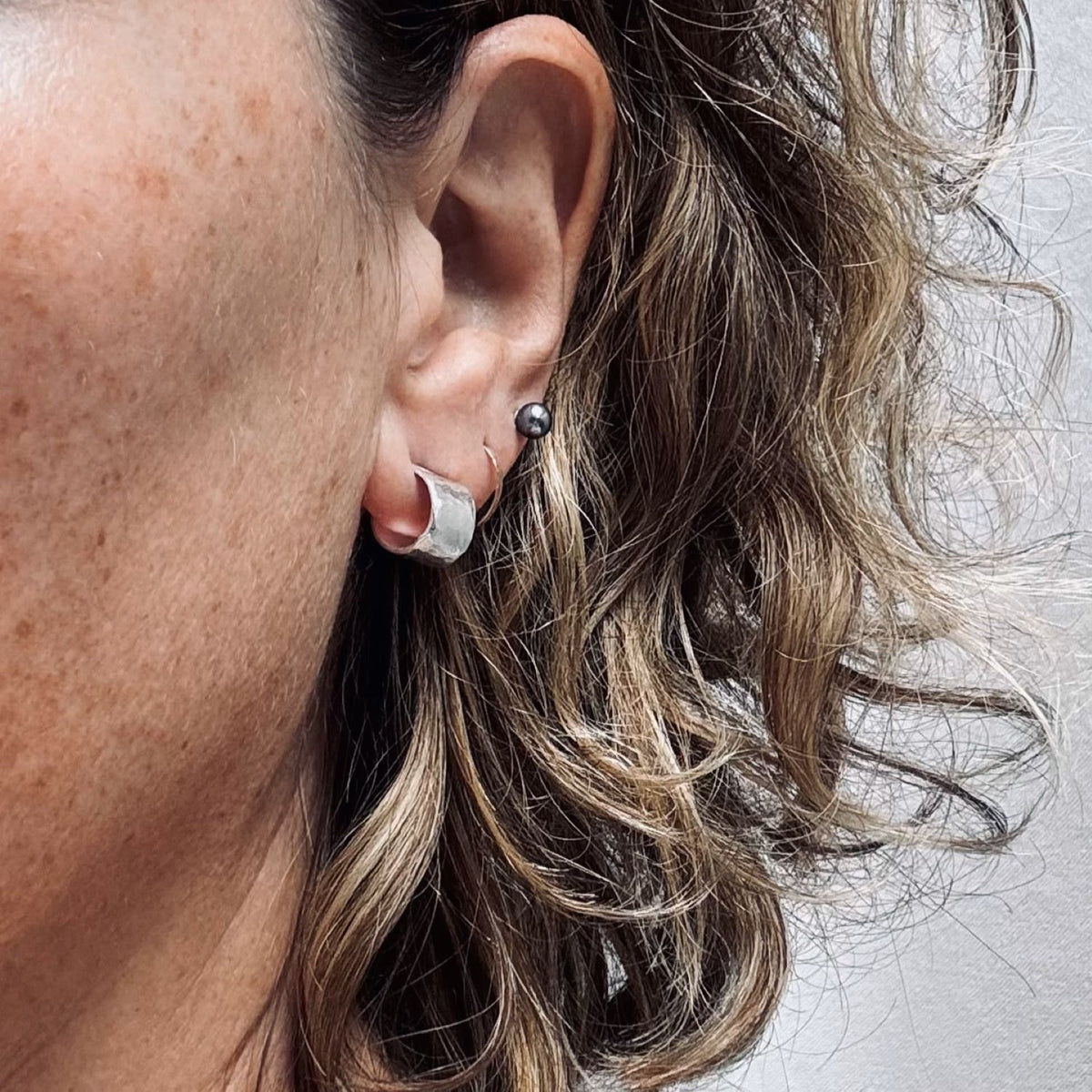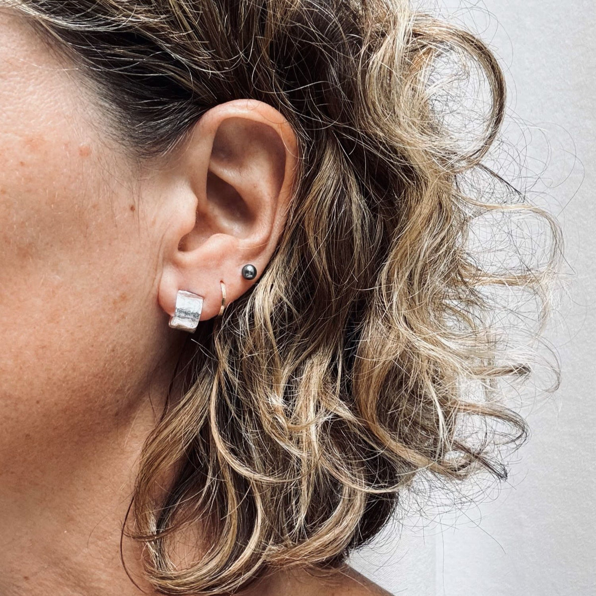 The Brutalist Circular Huggie In Silver by Oolo London is an interesting everyday statement. These small but chunky huggies are made from 100% recycled 925 sterling silver with an organic and hammered surface, inspired by brutalist architecture. They have a post and butterfly back and are a good quality, contemporary statement that will last for years.
