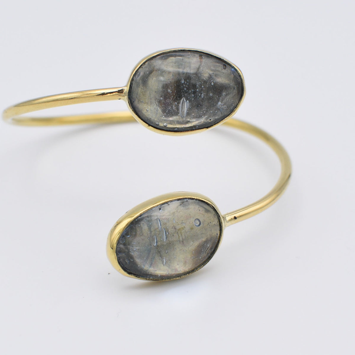 This bangle is hand-crafted from 100% recycled brass and features grey glass.