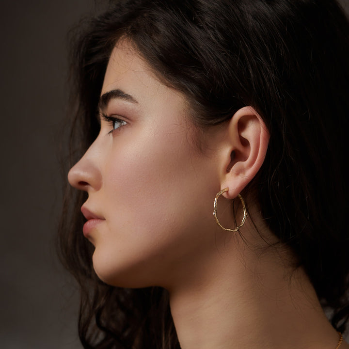 These Cairn Gorm Gold Vermeil Sterling Silver Hoop Earrings by Janus Edinburgh are named for the majestic Scottish mountain, Cairn Gorm. The irregular oval shape and beaten, rocky textures are an ode to the mountain's wild beauty. These hoops are a perfect way to elevate your everyday style, offering a bold and unique statement piece. They embody the strength and beauty of nature in a wearable form.
