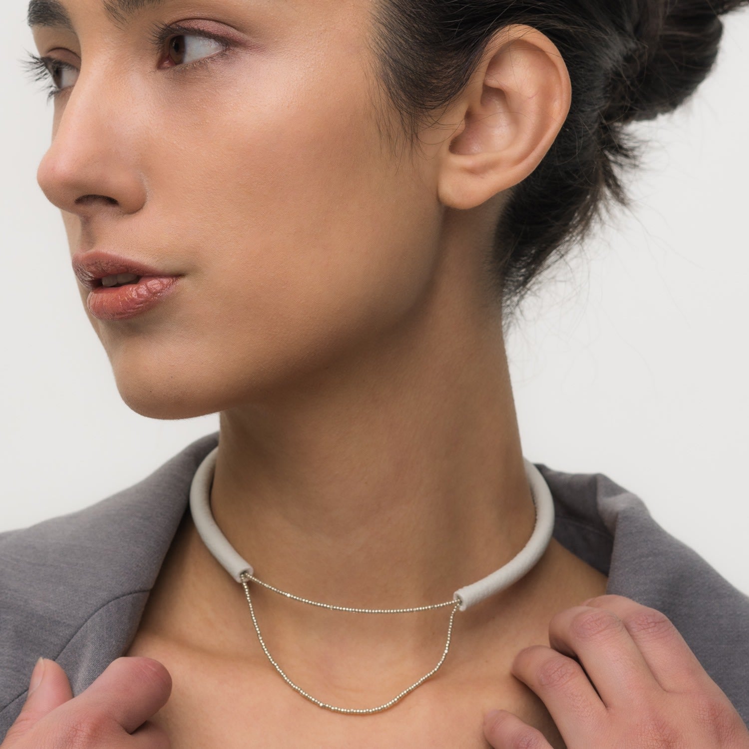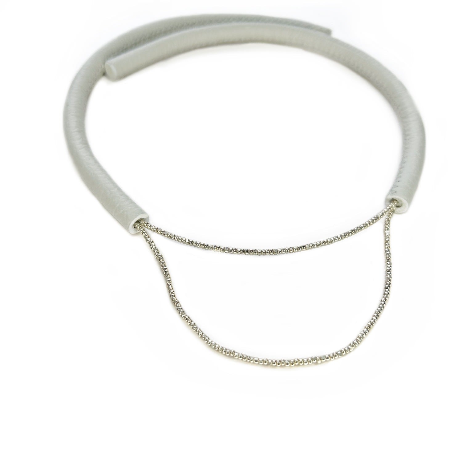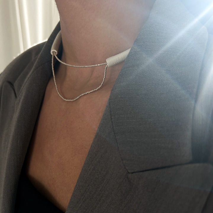This Leather Choker With Glass Beads White by Waiwai is a minimalist and striking accessory. This handcrafted choker combines soft off-white leather with delicate Japanese glass beads. The choker is lightweight and modern, offering effortless elegance. It has no clasp and can be worn with the opening at the front, flexing easily to adjust to the neck size.