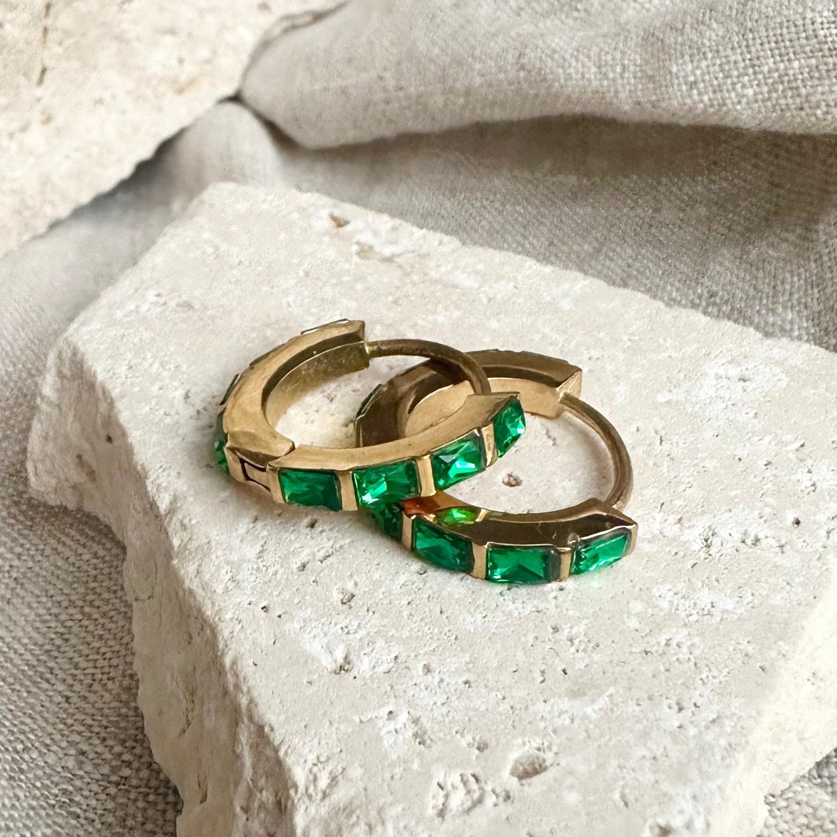 These waterproof, sweat-resistant, and anti-tarnish hoop earrings are crafted from 18k gold-plated stainless steel with vivid emerald-cut stones.