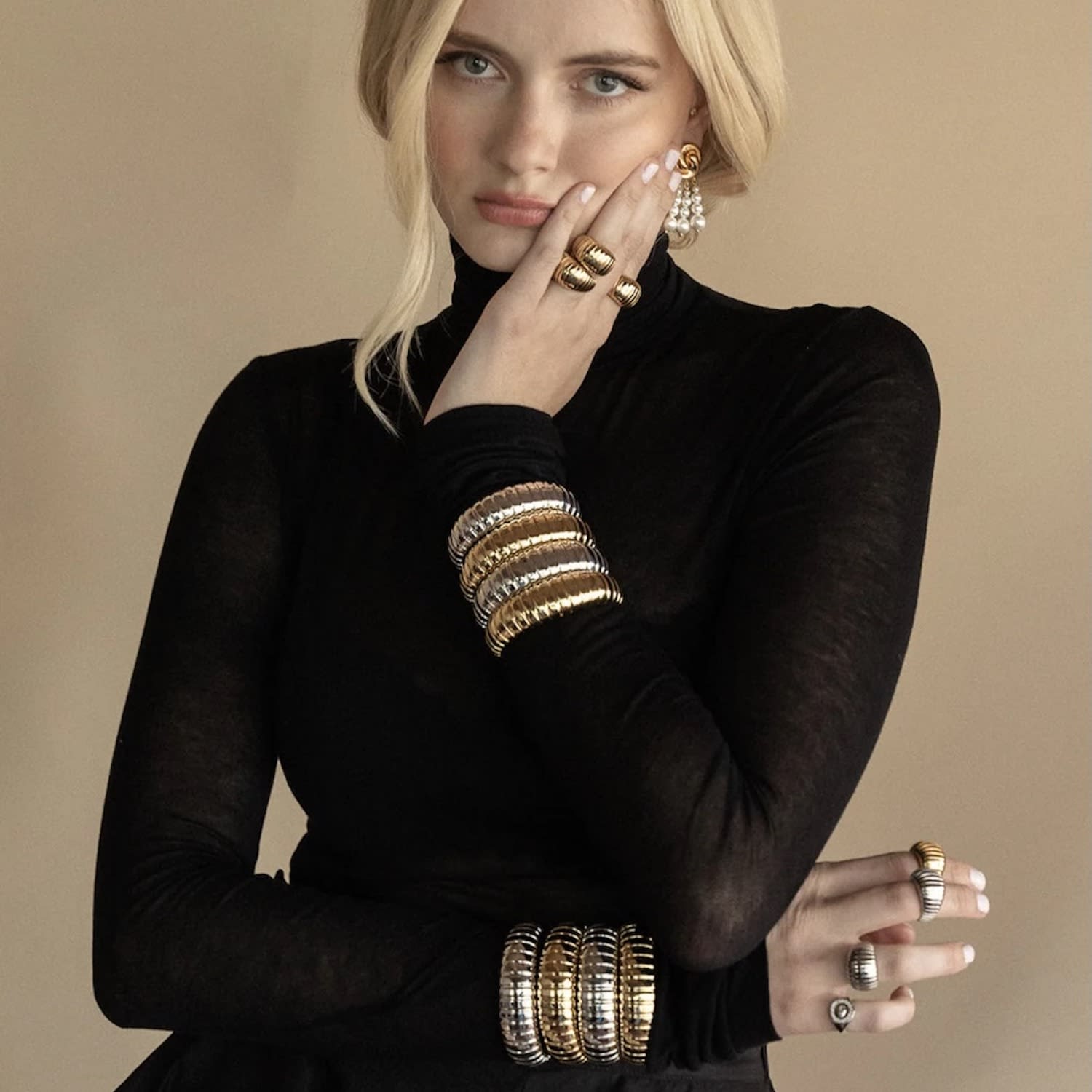 This Sapho Cuff by Zeppelin the Label is a bold reimagination of feminine power, designed to be a statement of strength and poetry. Crafted from gold- and rhodium-plated brass, its sculptural, ribbed design evokes resilience and fluidity. The cuff is inspired by the legendary poet Sappho and is made for women who lead with both fire and grace. Whether worn solo or stacked, this cuff is an emblem of self-expression and unapologetic confidence.