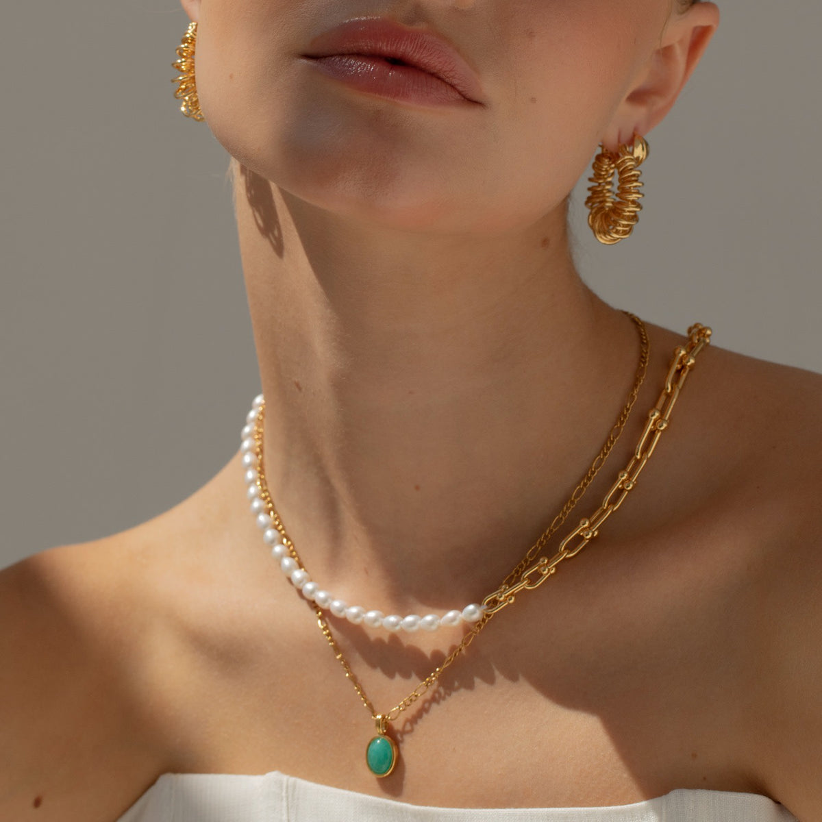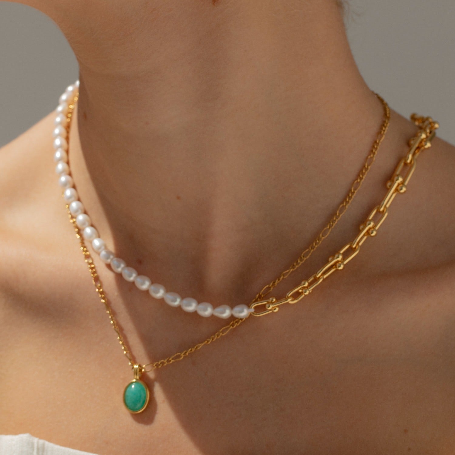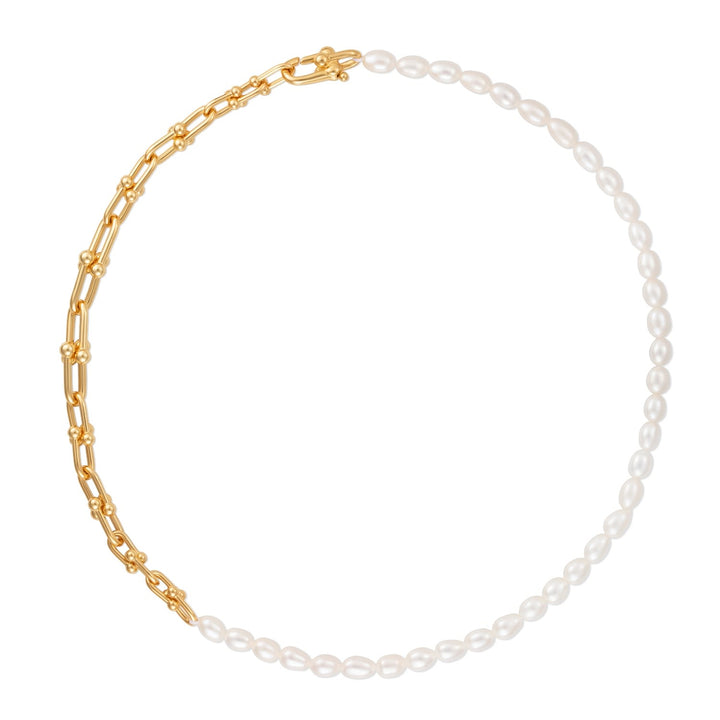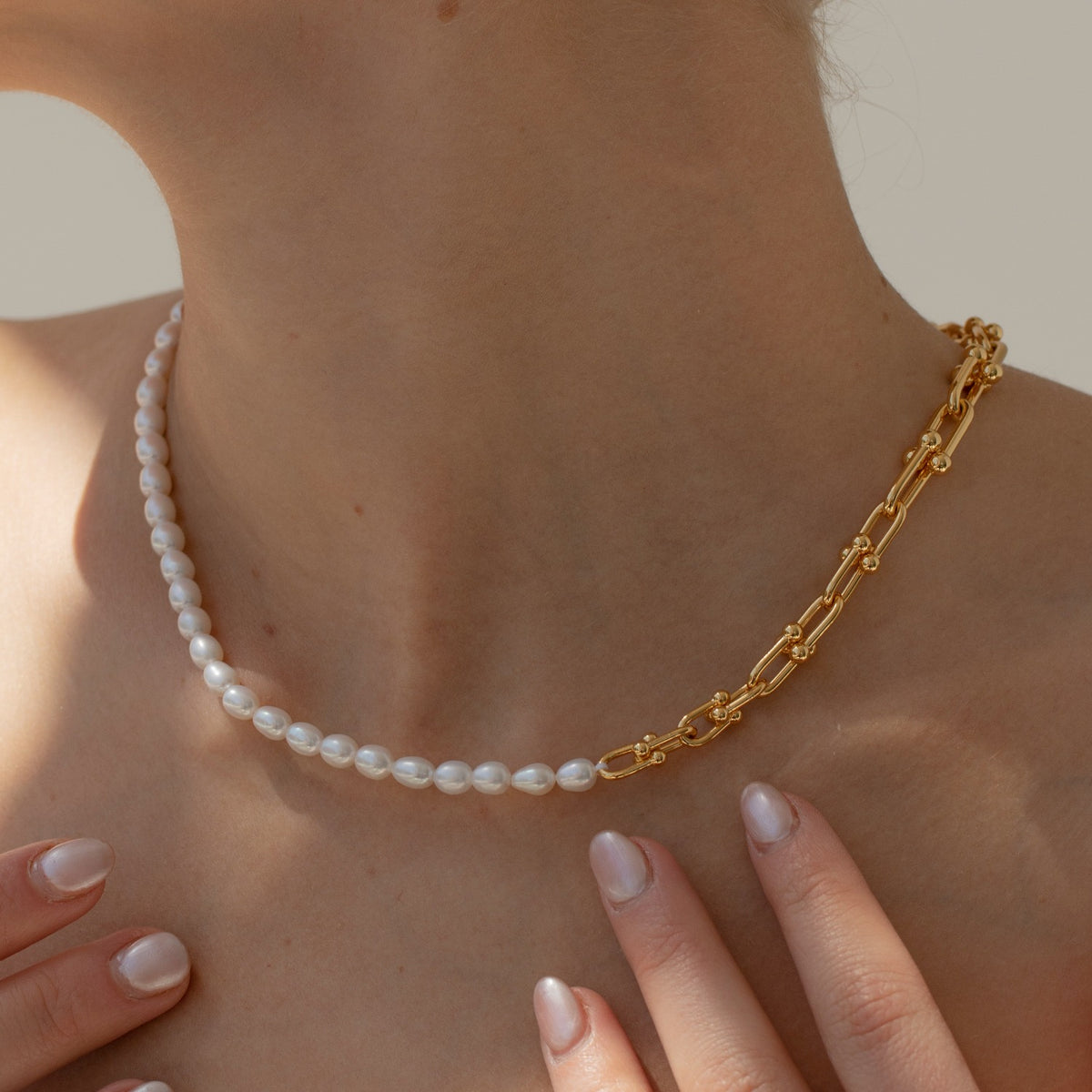 This necklace is crafted from 18ct gold-plated brass with a string of natural pearls. The design features a half-chain and half-pearl asymmetrical look.