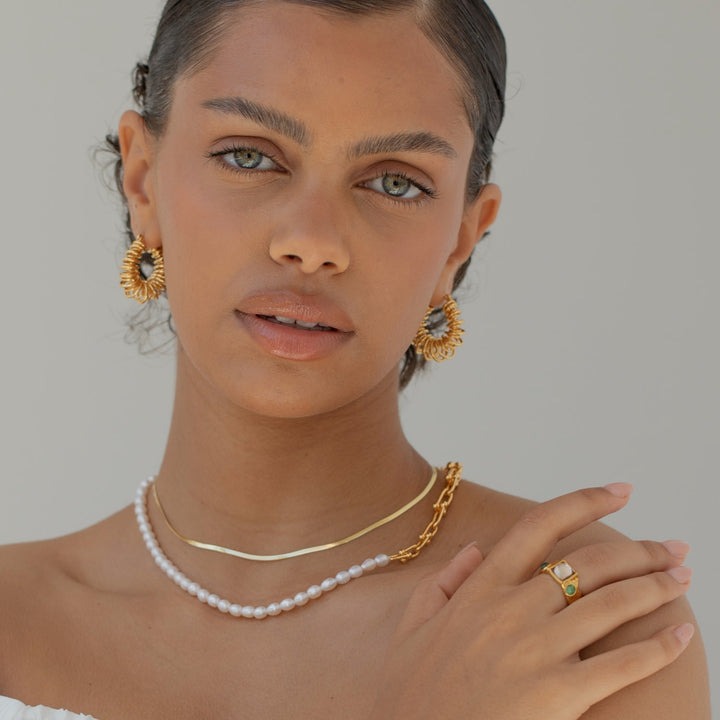 This Kallie Gold Links Half Pearl Necklace by Arctic Fox & Co. is a bold and stylish fusion of classic elegance and modern design. It features an asymmetrical look, with intricately detailed gold-plated chain links on one side and a string of natural pearls on the other. This striking combination creates a perfectly balanced and unique statement piece. Whether you're dressing up a casual outfit or complementing evening wear, Kallie adds instant polish and a sophisticated, modern flair.