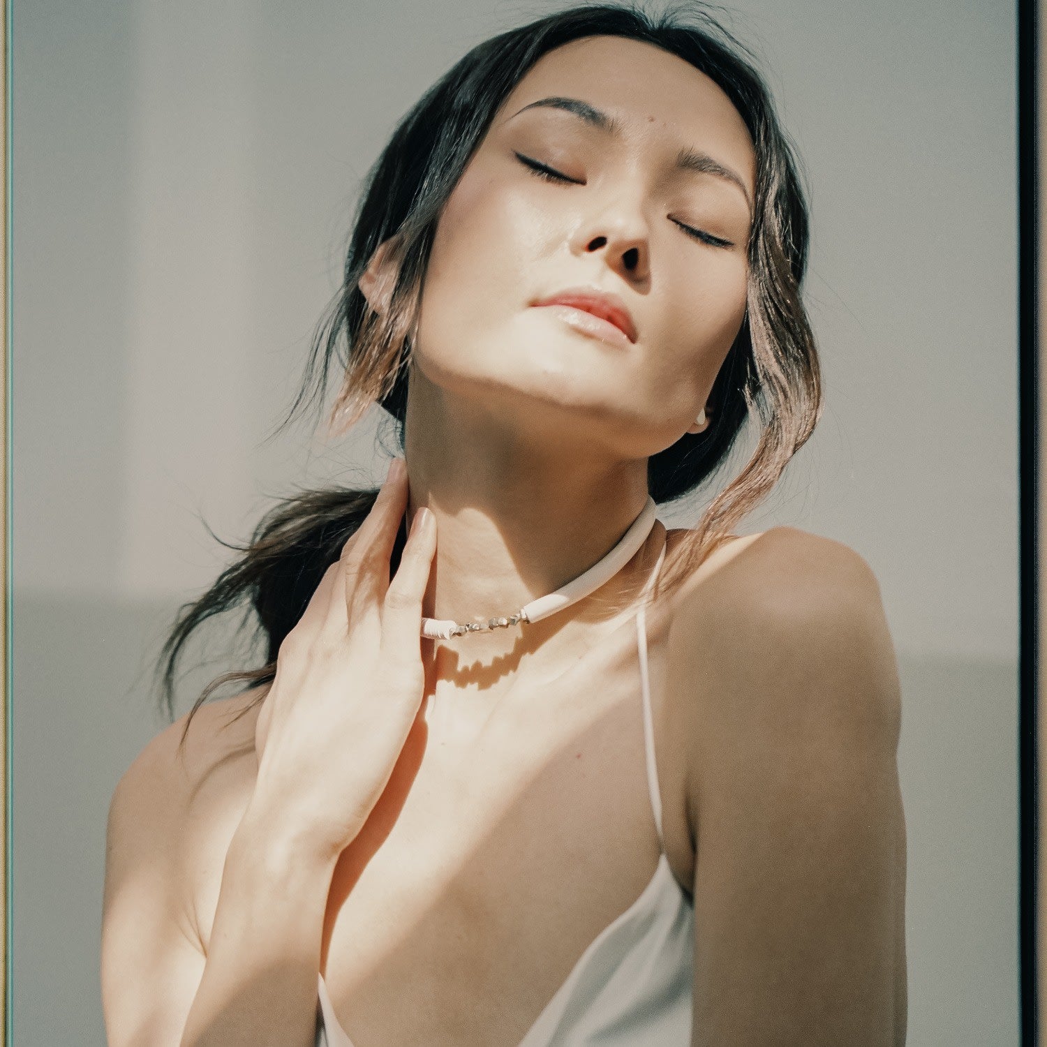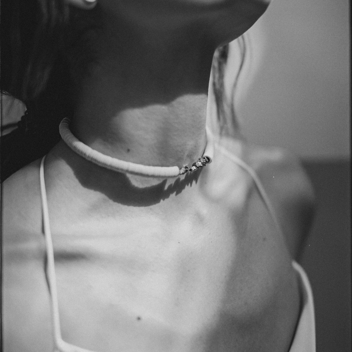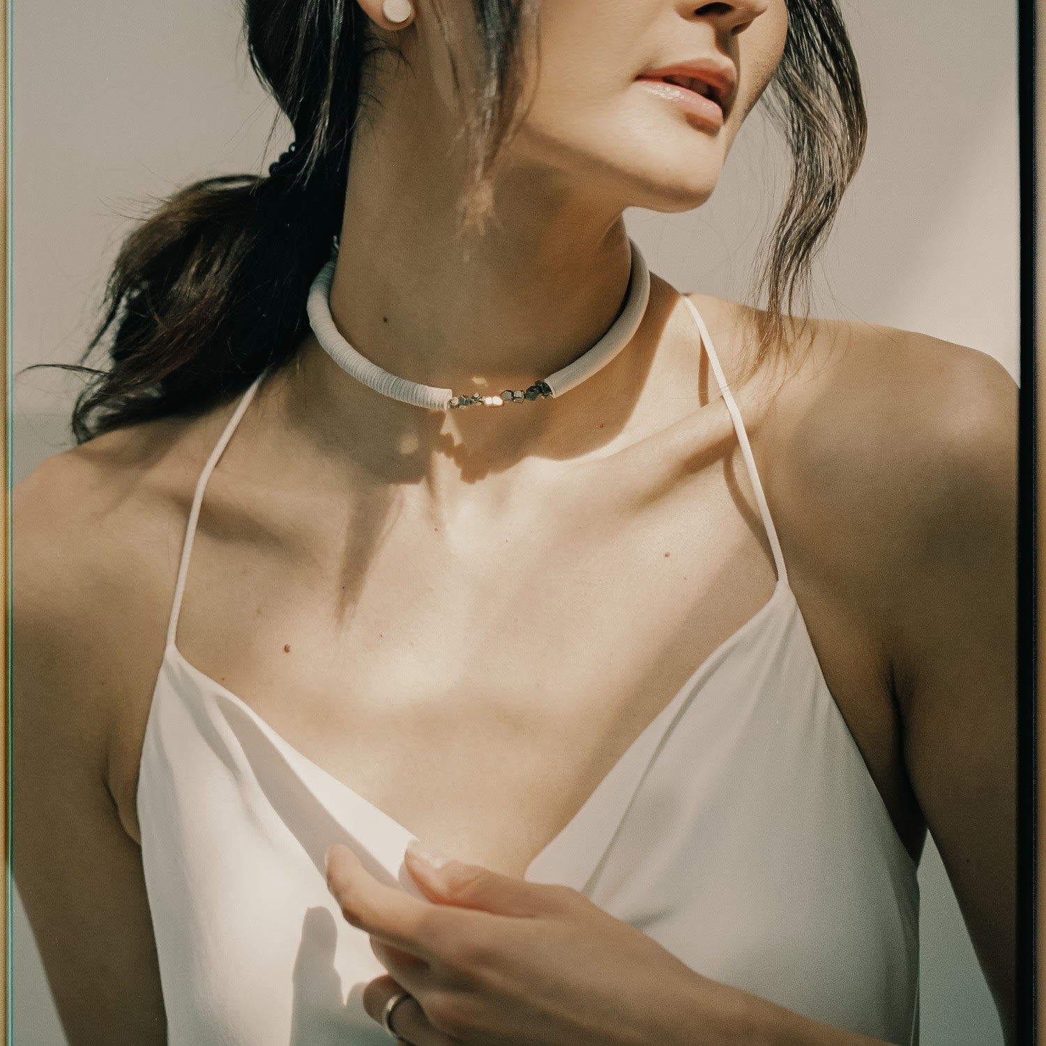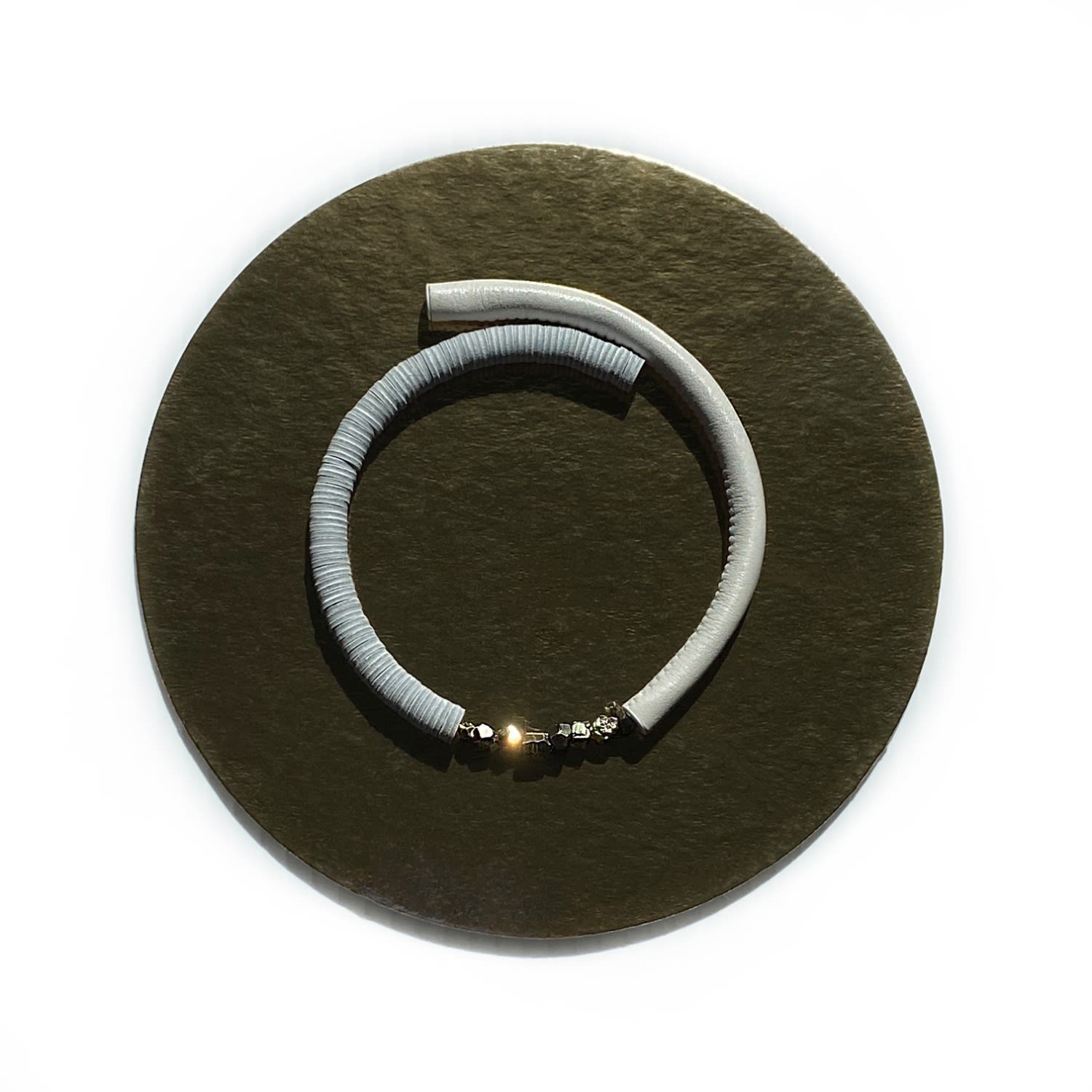 This choker is made of soft, supple white leather and features pyrite crystals. It has no clasp and is designed to flex easily.