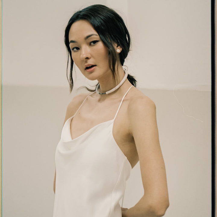 The White Leather Choker With Pyrite Crystals by Waiwai is a bold and unique accessory. It features a hand-stitched leather tube on one side and textured leather sequins on the other. The pyrite crystals, with their metallic luster and jaggedness, are believed to deflect negative energy and promote mental and emotional strength. The choker is designed for maximum comfort, with no clasp, and can be worn with the opening at the front. This piece combines an earthy feel with a powerful, modern design.