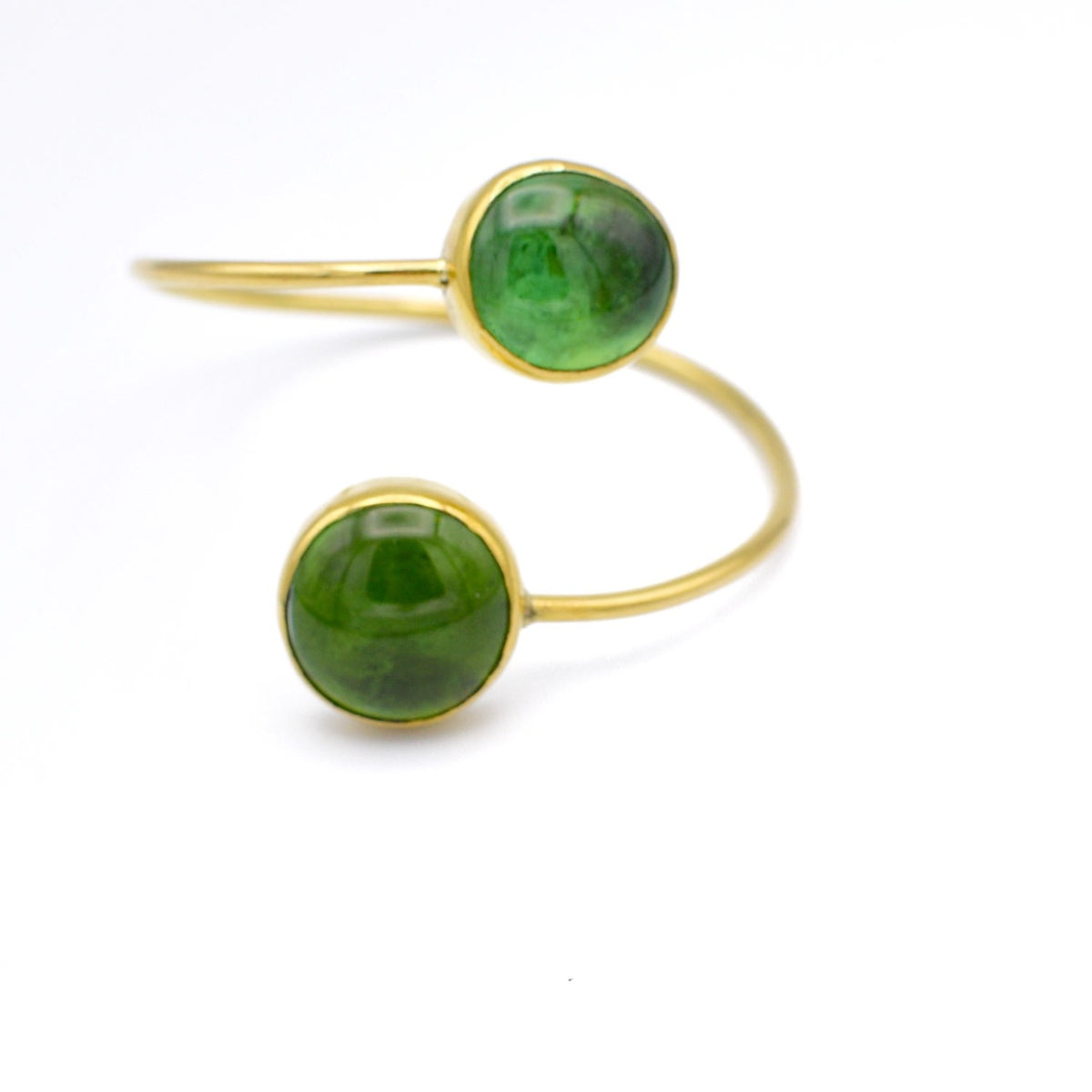 This bangle is hand-crafted from 100% recycled brass and features green glass.