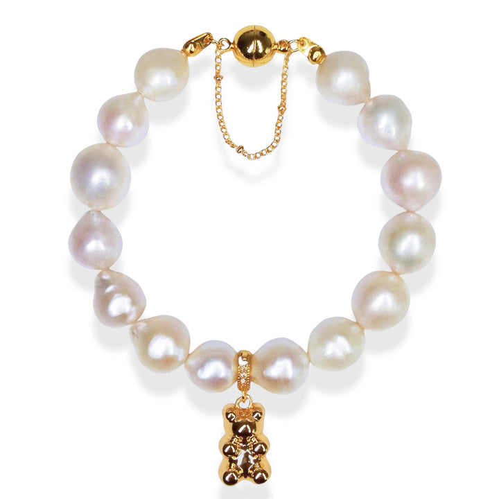 This bracelet is made from gold-filled findings and natural freshwater pearls. It features a detachable gold-tone bear charm.