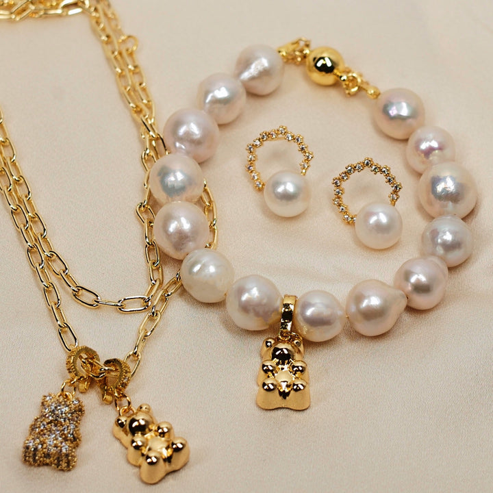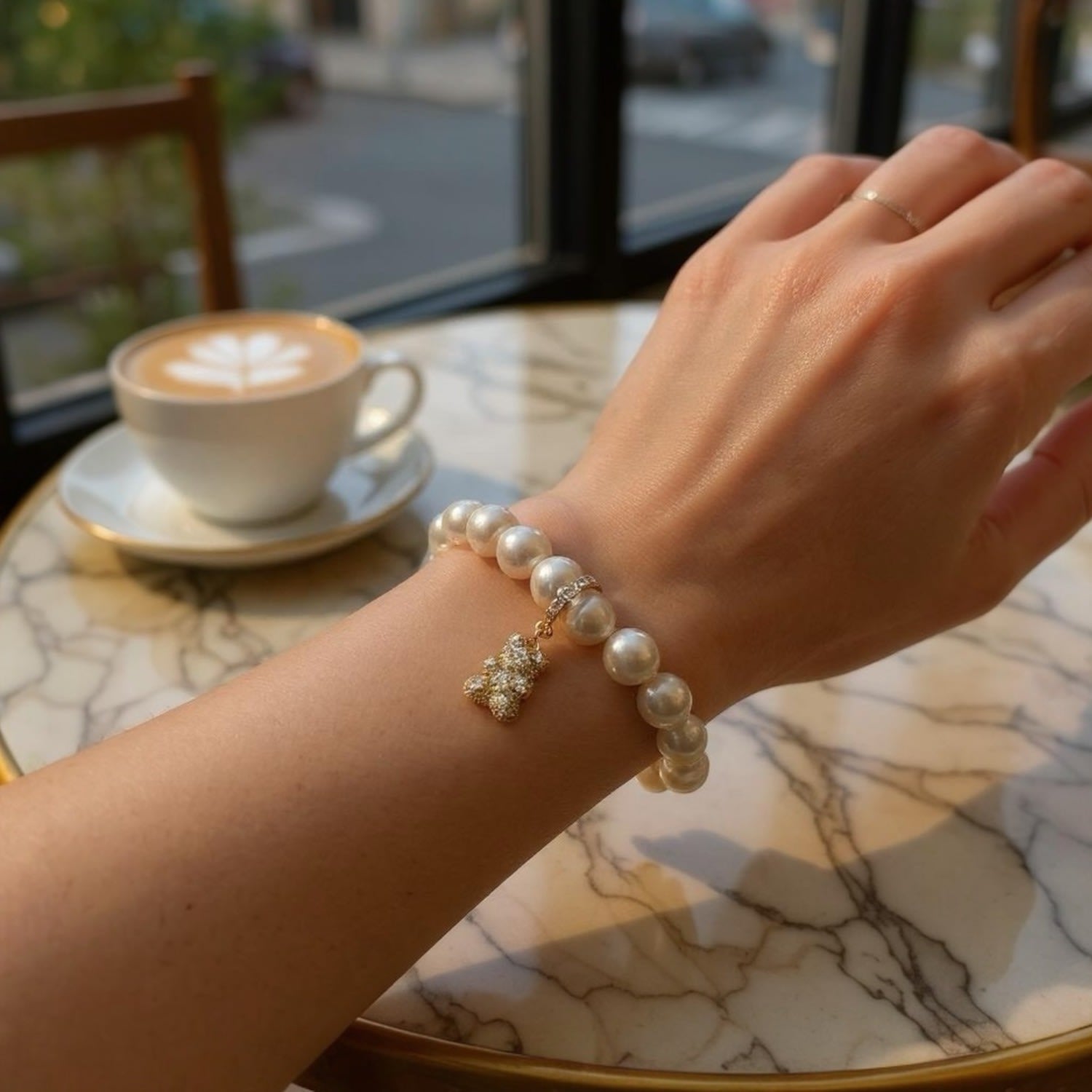 This Pearl Bear Charm Bracelet by Ninemoo is a unique piece that playfully combines classic elegance with a touch of modern whimsy. The lustrous freshwater pearls provide a timeless foundation, while the gold-tone bear charm adds a delightful, unexpected twist. The charm is easily detachable, offering a customizable and versatile accessory. This bracelet is for the person who loves to mix sophistication with a fun, charming aesthetic, making it perfect for adding personality to any outfit.