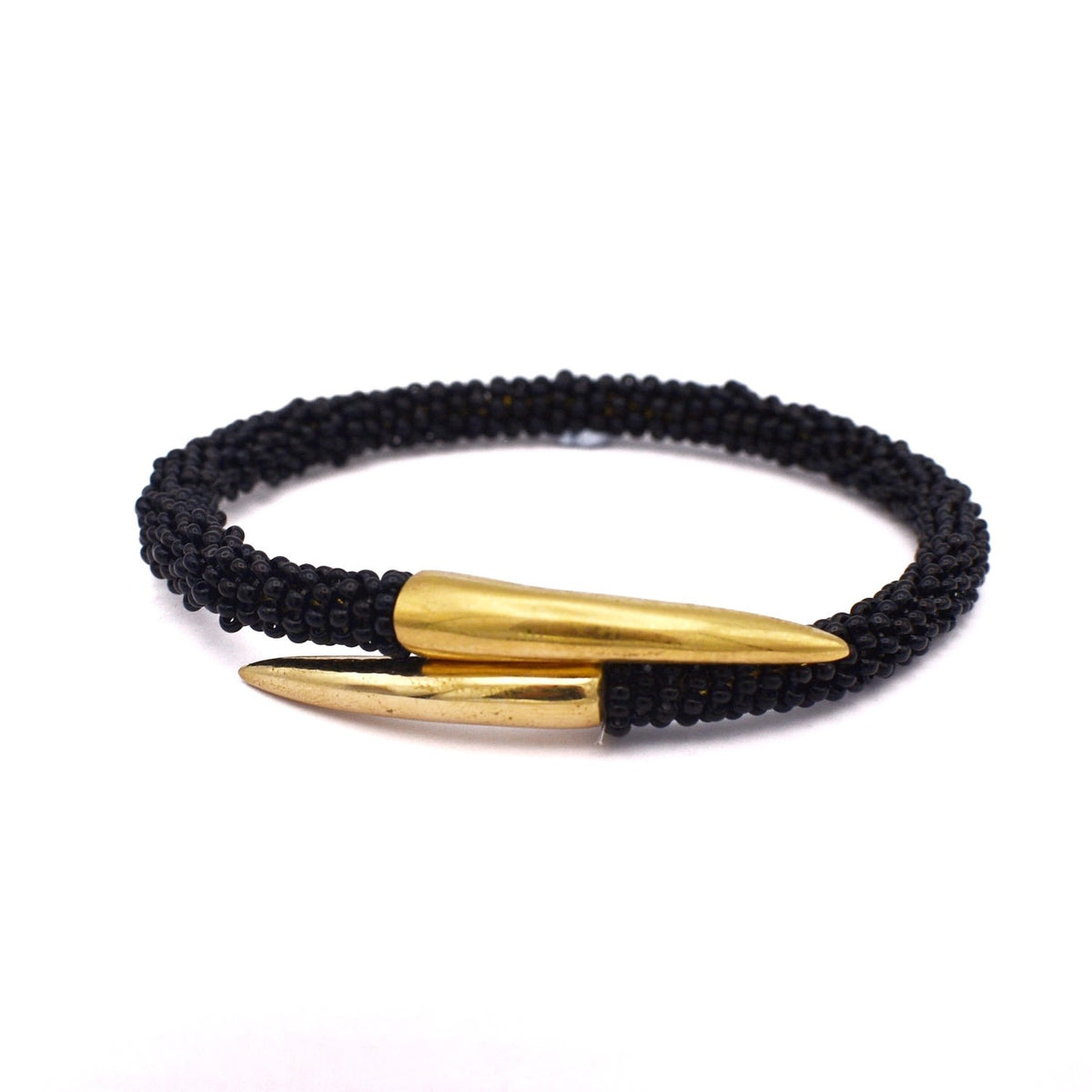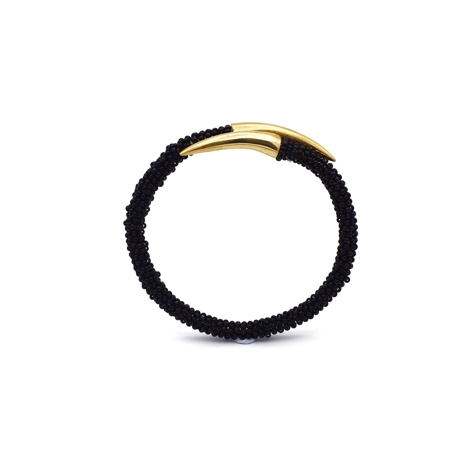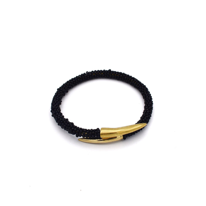 This bangle is hand-crafted from recycled brass and features black glass beads.