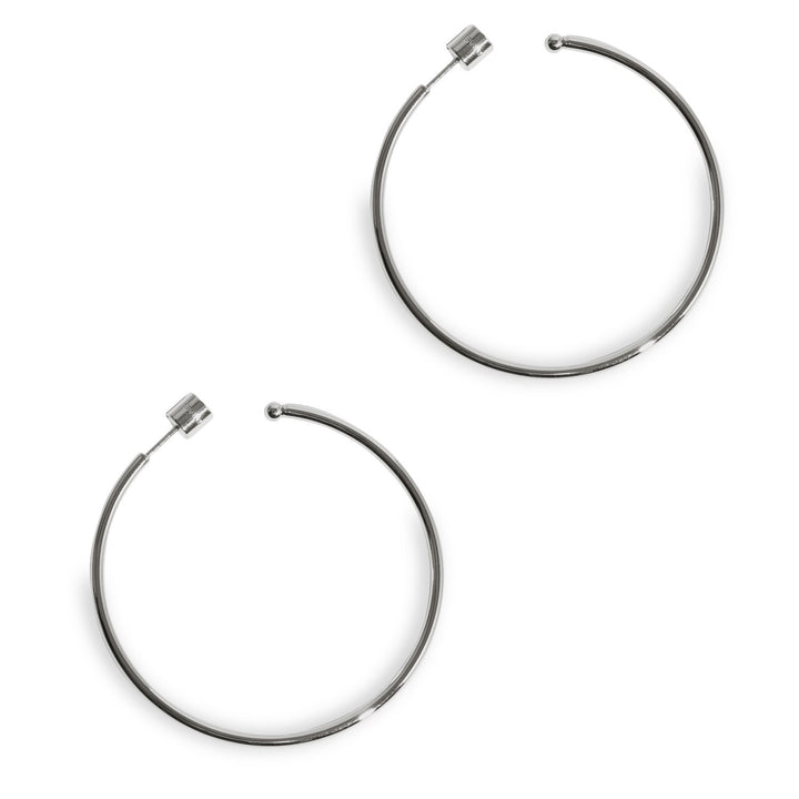 These Hazel Hoops Large Silver by Drae Collection are a perfect statement accessory with a 90s-inspired vibe. These lightweight and dainty hoops have a 50mm diameter, making them bold yet comfortable for everyday wear. They embody a cool and confident aesthetic, perfect for completing any outfit with a touch of retro flair. These hoops are a classic that will never go out of style.