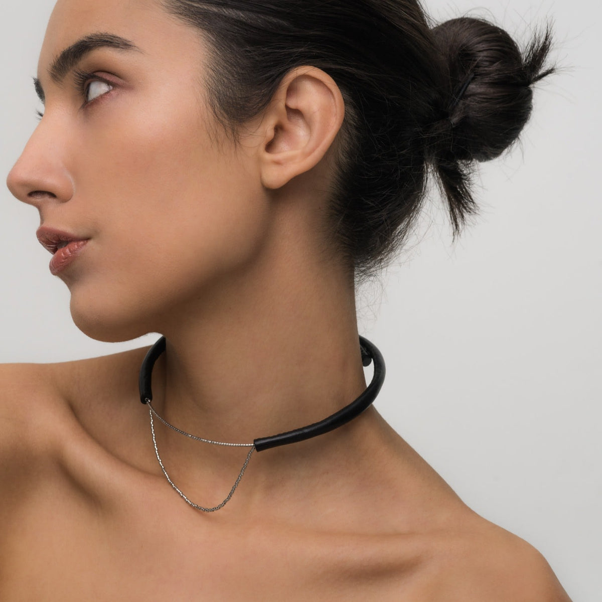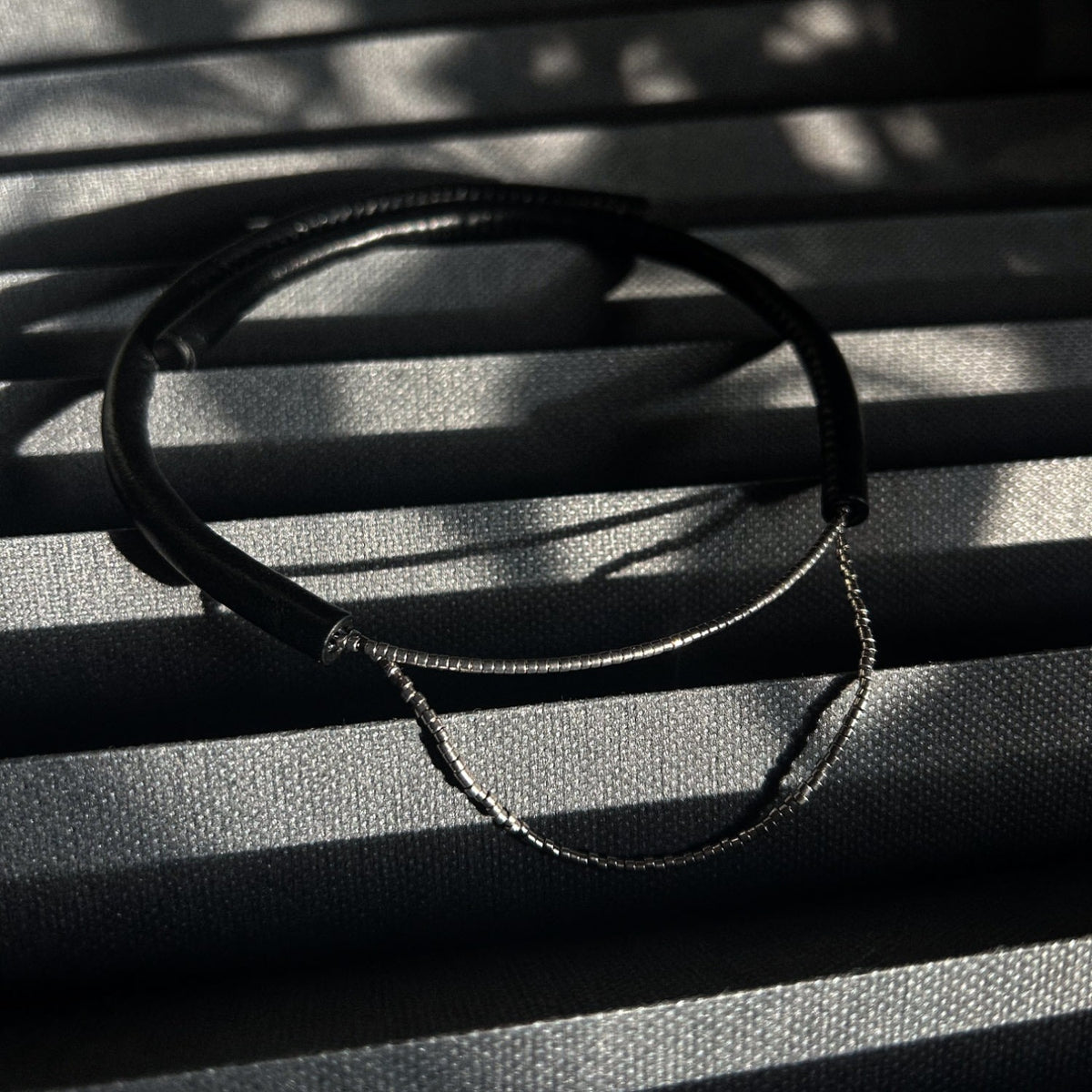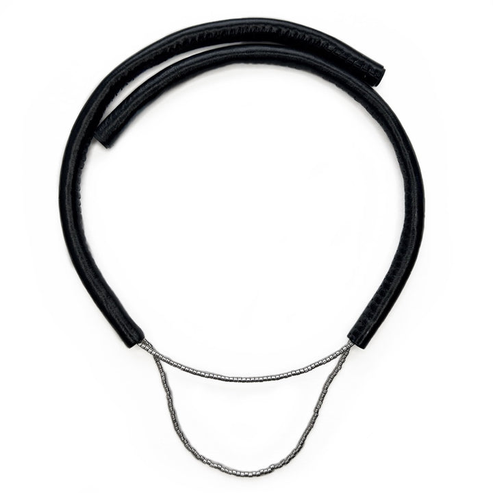 This Leather Choker With Glass Beads Black by Waiwai is a minimalist and striking accessory. This handcrafted choker combines smooth black leather with delicate silver Japanese glass beads. The bold leather curves are contrasted by the shimmering strands, creating a refined balance of textures. It is lightweight, modern, and offers effortless elegance, making it a standout piece. The choker has no clasp and flexes easily to put on and adjust.