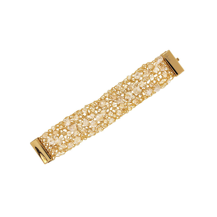 This Clear & Gold Aurora Handmade Bracelet by Lavish by Tricia Milaneze is a stunning statement piece that proves jewelry can be both bold and lightweight. Hand-crocheted by skilled Brazilian artisans using 18-karat gold-filled wire and shiny clear crystals, this bracelet creates a captivating, sculptural look without being bulky. Each unique piece carries the artist's fingerprints, imbuing it with a soul that transforms and inspires. It is an ideal accessory for adding a touch of light and handcrafted artistry to any occasion.