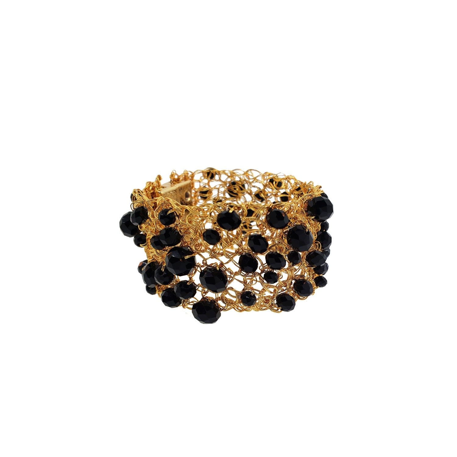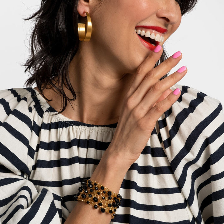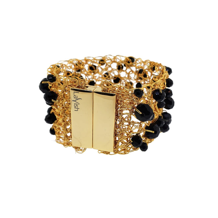 The Black & Gold Aurora Handmade Bracelet by Lavish by Tricia Milaneze is a statement piece with an artistic flair. This bracelet is hand-crocheted by skilled Brazilian artisans using 18 karat gold-filled wire. The aesthetic is light, comfortable, and bold, designed to be worn for any occasion. Each piece is unique and bears the artist's fingerprints, giving it a soul and beauty that inspires. It is hypoallergenic and nickel-free.