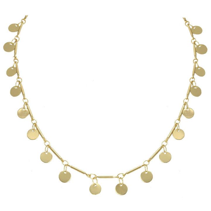 This necklace is handmade from an 18k gold plated bar link chain and features delicate coins. It is adjustable from 15 to 17 inches.