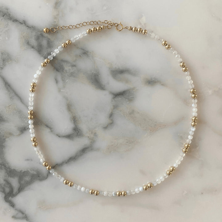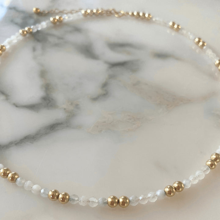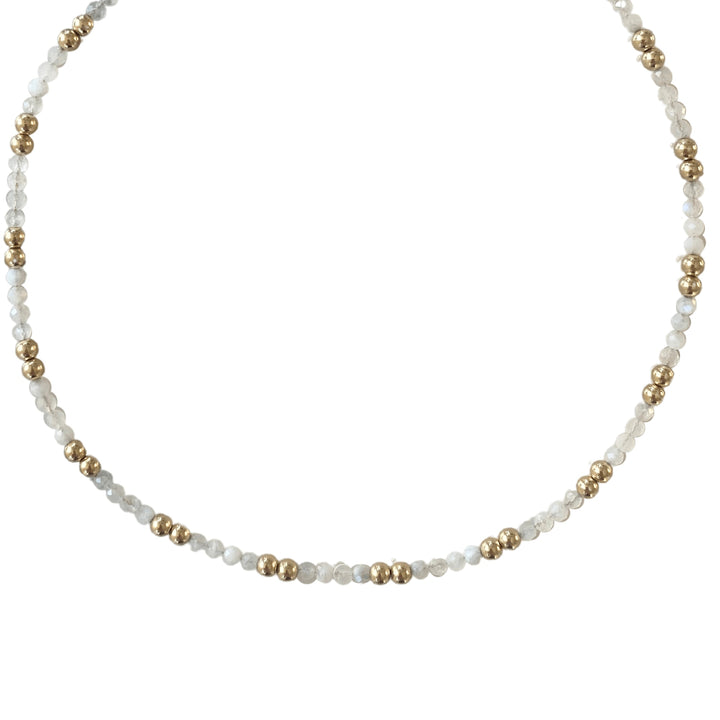 This choker is crafted from moonstone and 14K gold-filled beads. It measures 14 inches with a 2-inch extender.