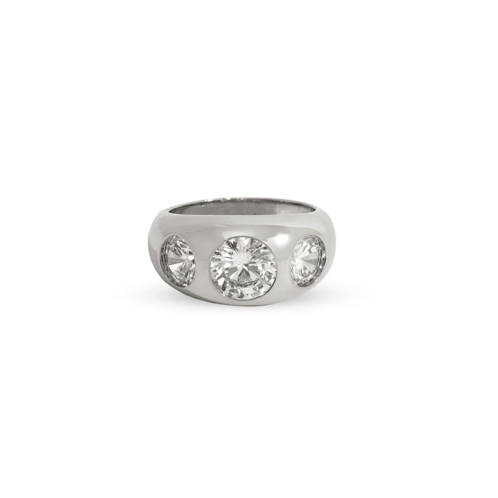 This Shine Ring Silver by Drae Collection is a perfect statement piece with a retro feel. The ring is crafted with a modular design and features three bold 4A-grade zirconia for maximum light-catching sparkle. Its unique style makes it a timeless addition to your accessory collection. This ring is a must-have for those who want to add a touch of glamour and sophistication to their look. It is high-quality, long-lasting, and resistant to tarnish and water.
